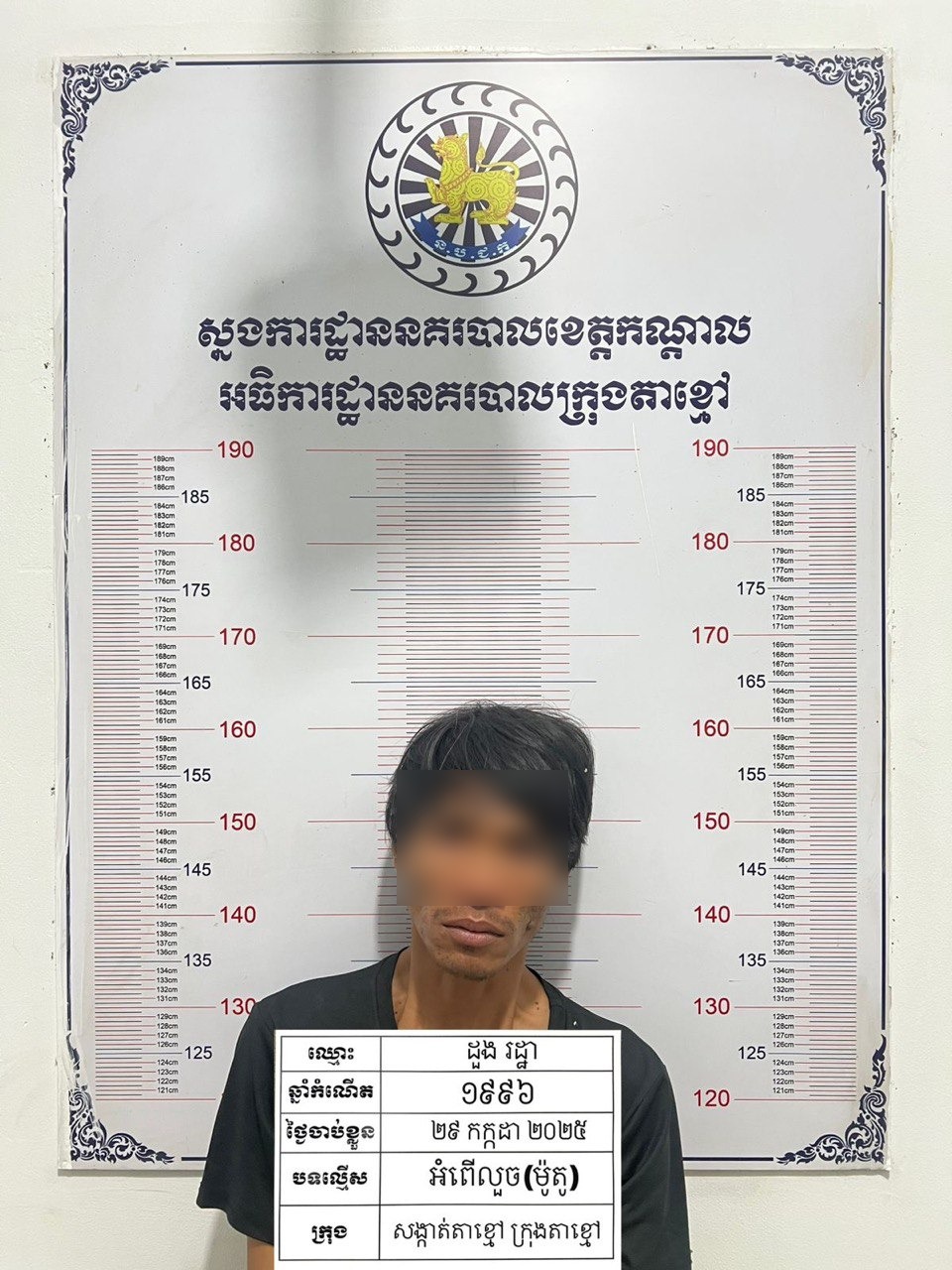 បុរសម្នាក់ដែលជាមុខសញ្ញាលួចម៉ូតូយ៉ាងសកម្ម ត្រូវបានកម្លាំងនគរបាលក្រុងតាខ្មៅឃាត់ខ្លួន កាលពីថ្ងៃទី៣០ កក្កដា ២០២៥ បន្ទាប់ពីជាប់ពាក់ព័ន្ធនឹងករណីលួចម៉ូតូ ២លើកផ្សេងគ្នា ដែលបានកើតឡើងកាលពីខែមិថុនា ឆ្នាំ២០២៥។ ជនសង្ស័យរូបនេះក៏ត្រូវបានរកឃើញថា មានផ្ទុកសារធាតុញៀនក្នុងទឹកនោមផងដែរ។