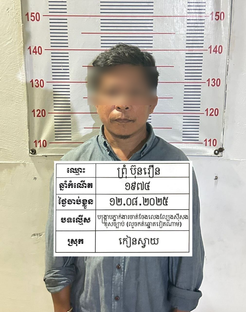 កណ្ដាល៖ បុរសម្នាក់ត្រូវបានកម្លាំងនគរបាលស្រុកកៀនស្វាយឃាត់ខ្លួន ខណៈកំពុងធ្វើសកម្មភាពកត់ឆ្នោតវៀតណាមខុសច្បាប់នៅក្រោយផ្ទះរបស់ខ្លួន កាលពីថ្ងៃទី១២ សីហា ២០២៥ វេលាម៉ោង ១៦:៣០នាទីរសៀល នៅភូមិគគីរធំ ឃុំគគីរធំ ស្រុកកៀនស្វាយ។
