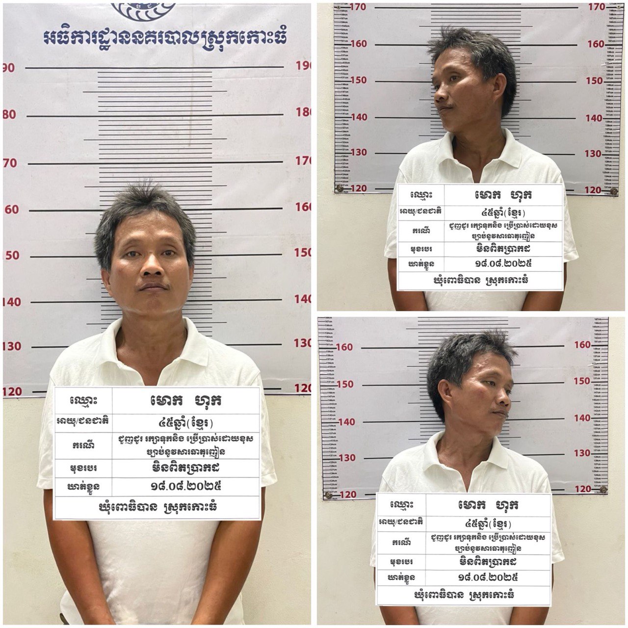 យោងតាមរបាយការណ៍របស់សមត្ថកិច្ចបានឲ្យដឹងថា ក្រោយពីទទួលបានព័ត៌មានពីប្រជាពលរដ្ឋល្អថាមានមុខសញ្ញាកំពុងធ្វើសកម្មភាពលក់និងចែកចាយគ្រឿងញៀន កម្លាំងនគរបាលផ្នែកប្រឆាំងគ្រឿងញៀនស្រុកកោះធំ សហការជាមួយកម្លាំងប៉ុស្តិ៍នគរបាលពោធិបាន បានចុះធ្វើការបង្ក្រាប។ ពេលទៅដល់ទីតាំង សមត្ថកិច្ចបានឃើញជនសង្ស័យឈ្មោះ មោក ហុក (ប្រុស, ៤៥ឆ្នាំ) កំពុងជិះម៉ូតូតែម្នាក់ឯងធ្វេសកម្មភាពលក់ថ្នាំញៀន។