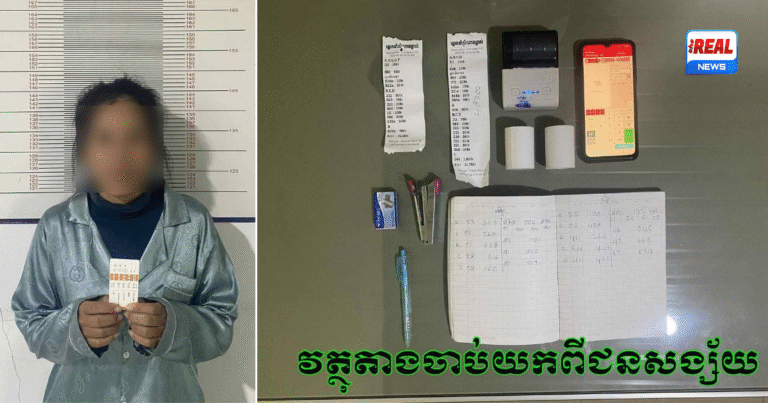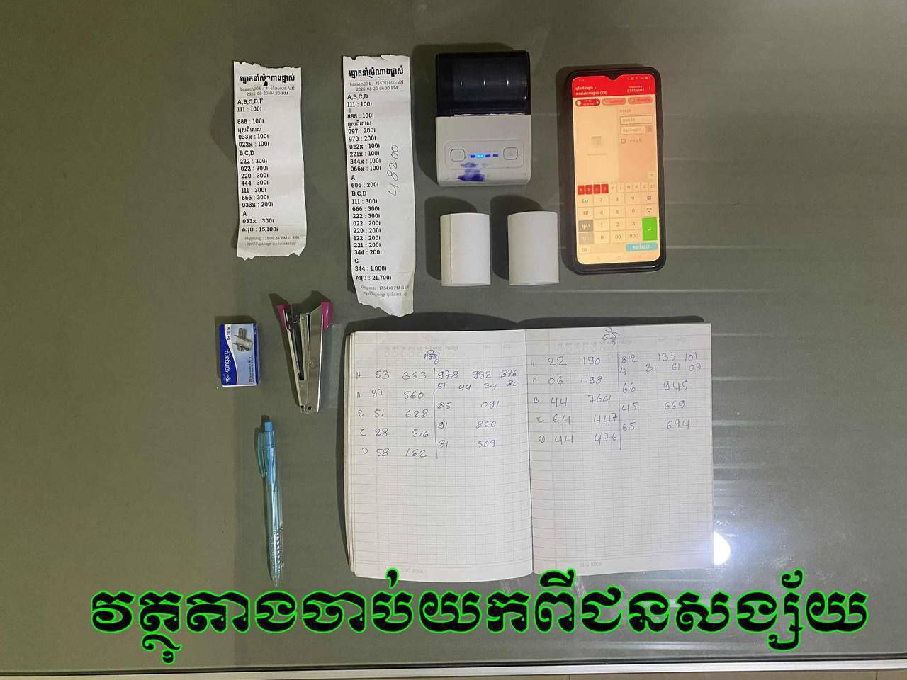 វត្ថុតាងដែលចាប់យកបានរួមមាន៖ ទូរស័ព្ទដៃ ១គ្រឿង, ប៊ិក ១ដើម, សៀវភៅកត់លេខឆ្នោត ១ក្បាល, ម៉ាស៊ីនព្រីនលេខឆ្នោត ១គ្រឿង, ដែកកឹប ១, គ្រាប់កឹប ១ប្រអប់, និងក្រដាសព្រីនលេខឆ្នោត ២ដុំ។