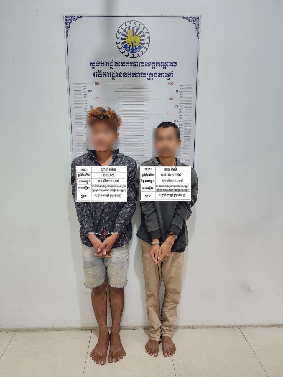 លោកវរសេនីយ៍ឯក យី វណ្ណដា អធិការនគរបាលក្រុងតាខ្មៅបានឲ្យដឹងថា ជនសង្ស័យដែលត្រូវបានឃាត់ខ្លួនមានឈ្មោះ ឡេង ម៉ាលិ (ប្រុស, ២៧ឆ្នាំ) និងឈ្មោះ ណាគ្រី ភារម្យ (ប្រុស, ២០ឆ្នាំ)។ ជនសង្ស័យទាំងពីរនាក់គ្មានមុខរបរពិតប្រាកដ រស់នៅភូមិផ្សាកណ្ដាល សង្កាត់ផ្សារកណ្ដាល ខណ្ឌដូនពេញ រាជធានីភ្នំពេញ ហើយមានលទ្ធផលតេស្តទឹកនោមវិជ្ជមាន(+)សារធាតុញៀន។