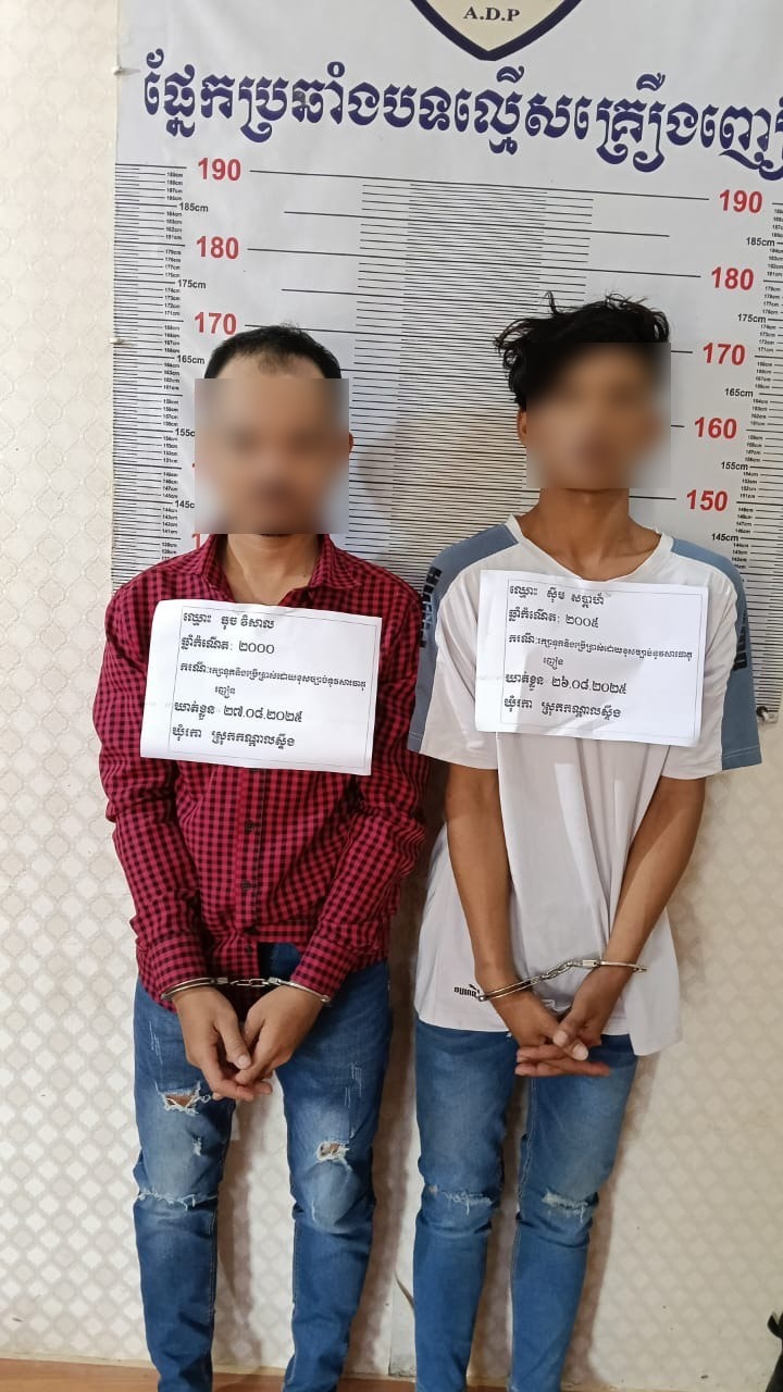 កណ្ដាល៖ យុវជន ២នាក់ត្រូវបានកម្លាំងនគរបាលស្រុកកណ្តាលស្ទឹងឃាត់ខ្លួន បន្ទាប់ពីម្នាក់ក្នុងចំណោមពួកគេបានព្យាយាមរត់គេចខ្លួនពេលសមត្ថកិច្ចចុះល្បាត ហើយត្រូវរកឃើញមានគ្រឿងញៀននៅក្នុងហោប៉ៅ។ ជនសង្ស័យទាំងពីរនាក់សុទ្ធតែមានសារធាតុញៀនក្នុងខ្លួន។ ហេតុការណ៍នេះបានកើតឡើងនៅថ្ងៃទី២៦ សីហា ២០២៥ វេលាម៉ោង ២២:៣០នាទី នៅលើផ្លូវក្នុងភូមិរកា ឃុំរកា ស្រុកកណ្តាលស្ទឹង។