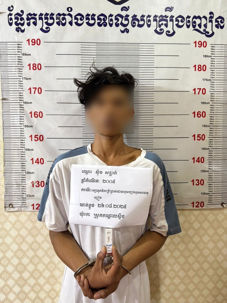 ប្រភពពីសមត្ថកិច្ចបានឲ្យដឹងថា ជនសង្ស័យដែលឃាត់ខ្លួនបានមានឈ្មោះ ស៊ីម សប្តាហ៍ (ប្រុស, ២០ឆ្នាំ) និងឈ្មោះ ធុច វិសាល (ប្រុស, ២៥ឆ្នាំ) ដែលពួកគេទាំងពីរនាក់ជាកម្មកររោងចក្រ និងមានទីលំនៅក្នុងភូមិឃុំកើតហេតុ។ កម្លាំងសមត្ថកិច្ចបានដកហូតវត្ថុតាងមានថ្នាំញៀនចំនួន ១កញ្ចប់តូច ដែលមានទម្ងន់ ០,០៤ក្រាម និងឧបករណ៍ប្រើប្រាស់មួយចំនួន។