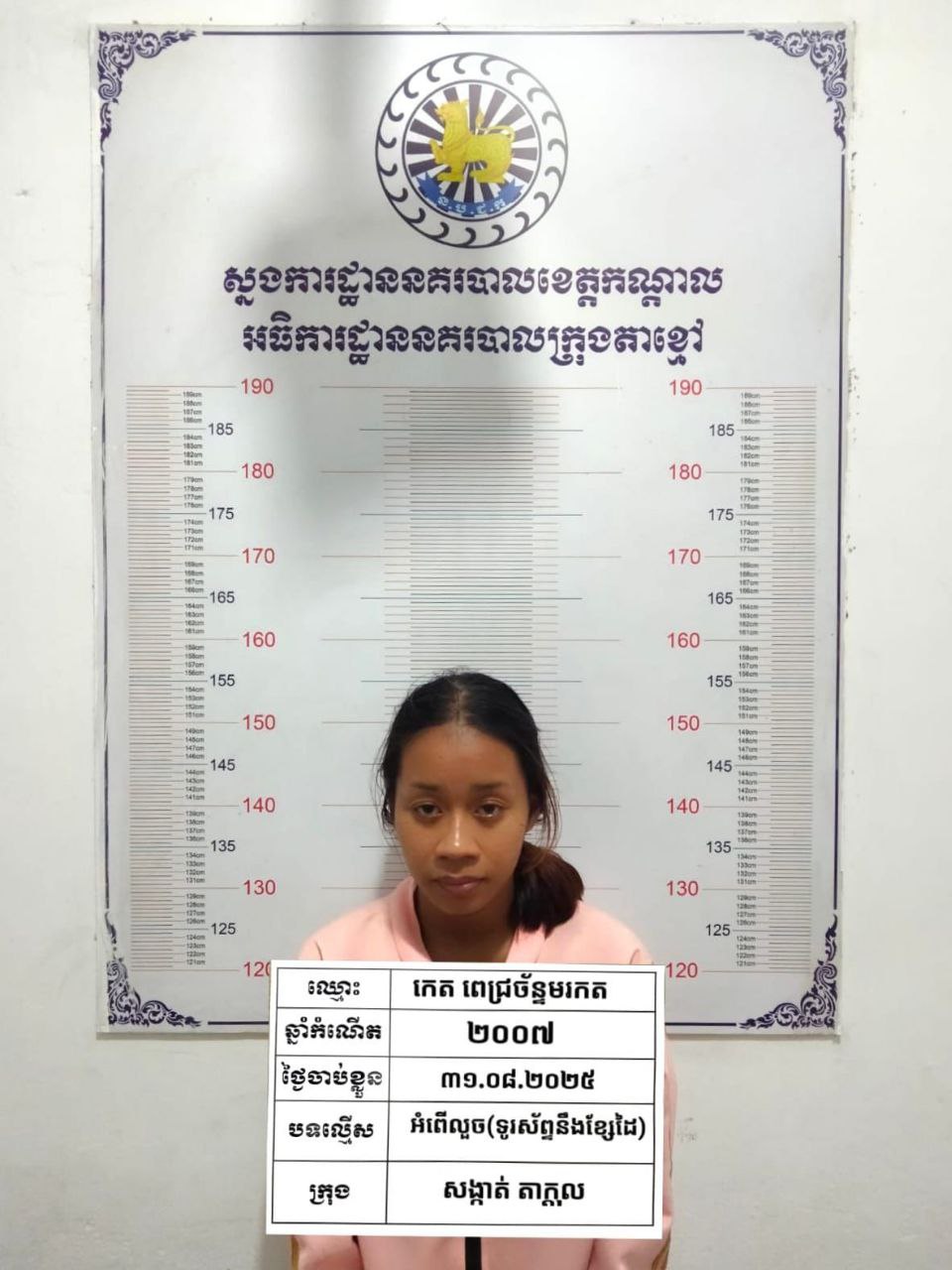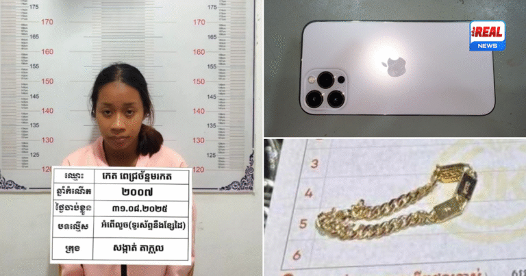 កណ្ដាល៖ នារីវ័យក្មេងម្នាក់ត្រូវបានម្ចាស់ផ្ទះតាមឃាត់ខ្លួនបានវិញ បន្ទាប់ពីនាងបានលួចយកទូរស័ព្ទដៃនិងខ្សែដៃប្លាទីនក្នុងផ្ទះ ខណៈដែលម្ចាស់ផ្ទះកំពុងងូតទឹក។ ហេតុការណ៍លួចនេះបានកើតឡើងនៅថ្ងៃទី១៥ សីហា ២០២៥ វេលាម៉ោង ១៦:៣០នាទី នៅភូមិព្រែកឡុង សង្កាត់តាក្ដុល ក្រុងតាខ្មៅ ហើយជនសង្ស័យត្រូវបានឃាត់ខ្លួនបាននៅថ្ងៃទី៣១ សីហា ២០២៥ នៅម្តុំណាហ្គាវើល រាជធានីភ្នំពេញ។