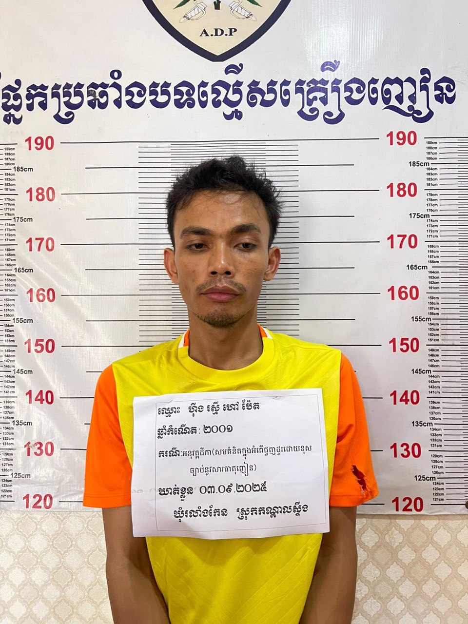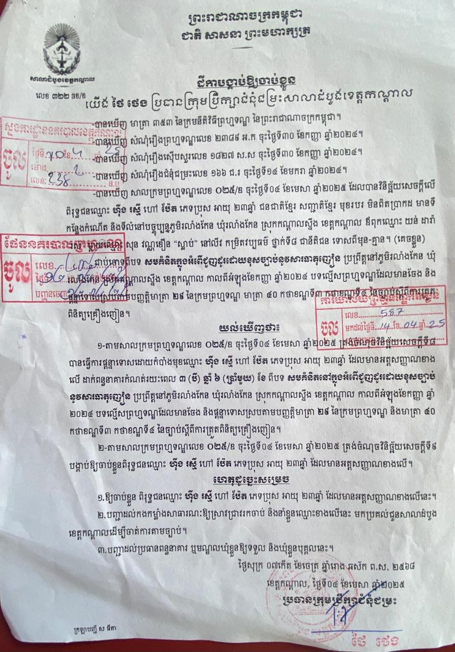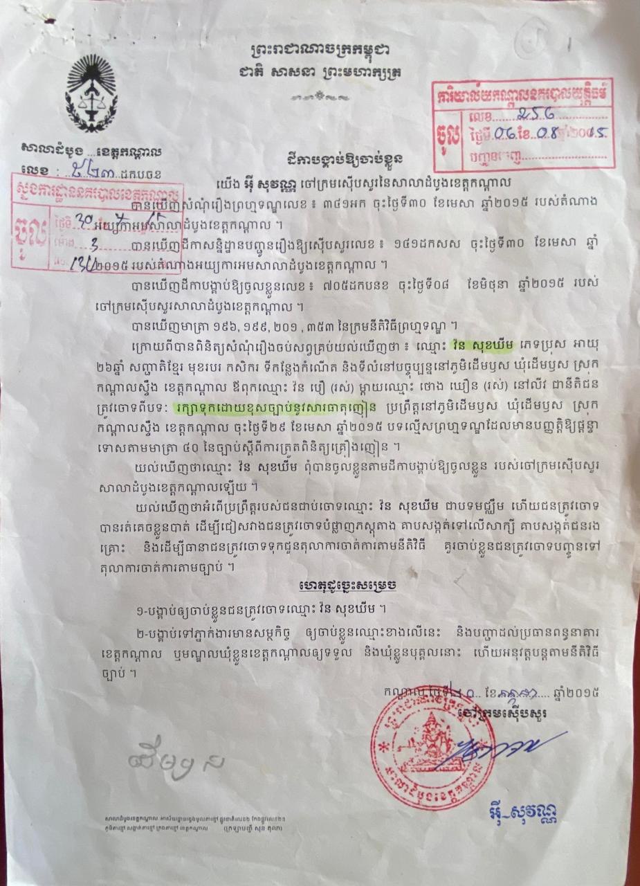 ប្រភពពីសមត្ថកិច្ចបានឲ្យដឹងថា ជនសង្ស័យទី១ មានឈ្មោះ វ៉ន សុខឃីម (ប្រុស, ៣៦ឆ្នាំ) ដែលមានដីកាចាប់ខ្លួនពីសាលាដំបូងខេត្តកណ្ដាល លេខ ៥២៣ដកបចខ ចុះថ្ងៃទី២៩ ខែមេសា ២០១៥ ពីបទរក្សាទុកដោយខុសច្បាប់នូវសារធាតុញៀន។ សមត្ថកិច្ចបានឃាត់ខ្លួនជនសង្ស័យរូបនេះនៅភូមិដើមឬស ឃុំដើមឬស។
