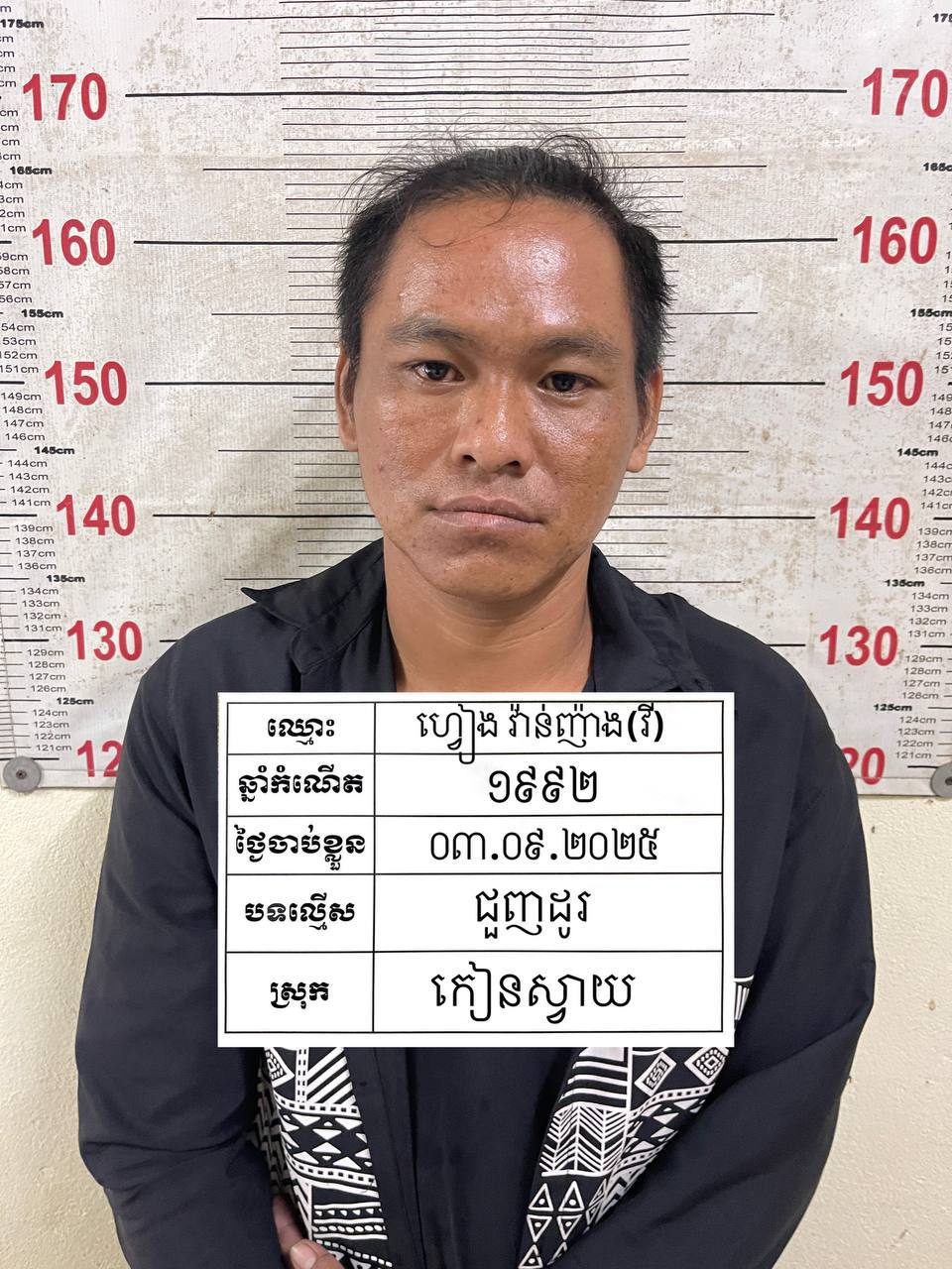 លោកវរសេនីយ៍ឯក ព្រុំ សំណាង អធិការនគរបាលស្រុកកៀនស្វាយបានឲ្យដឹងថា ជនសង្ស័យមានឈ្មោះ ហ្វៀង វ៉ាន់ញ៉ាង ហៅ វី (ប្រុស, ៣៣ឆ្នាំ) ដែលជាជនជាតិវៀតណាម។ ក្រោយពីទទួលបានព័ត៌មានពីប្រជាពលរដ្ឋថា មានករណីជួញដូរថ្នាំញៀននៅចំណុចកើតហេតុ កម្លាំងប៉ុស្តិ៍នគរបាលរដ្ឋបាលដីឥដ្ឋ បានសហការជាមួយកម្លាំងជំនាញប្រឆាំងគ្រឿងញៀនស្រុក ចុះទៅឃាត់ខ្លួនជនសង្ស័យរូបនេះភ្លាមៗតែម្ដង។
