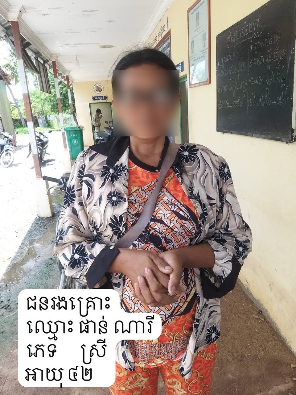 លោកវរសេនីយ៍ឯក ស៊ីម ឃាង អធិការនគរបាលស្រុកកោះធំ បានឲ្យដឹងថា ជនសង្ស័យដែលត្រូវបានឃាត់ខ្លួនមានឈ្មោះ សេង ដន (ប្រុស, ២៧ឆ្នាំ) រស់នៅភូមិឃុំកើតហេតុ។ ចំណែកជនរងគ្រោះមានឈ្មោះ ផាន់ ណារី (ស្រី, ៤២ឆ្នាំ) ដែលជាអ្នកលក់ត្រី។