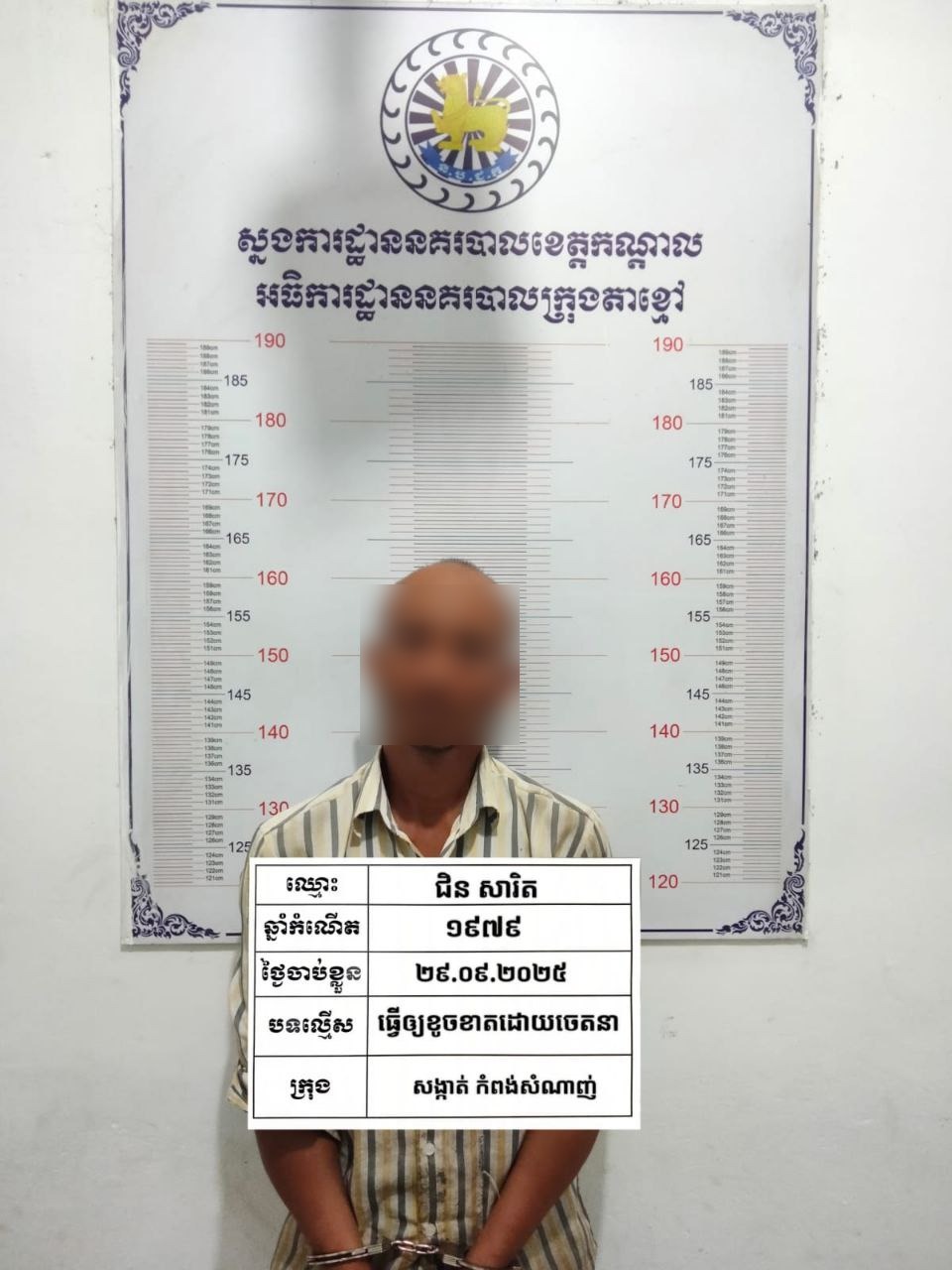 បុរសម្នាក់ដែលតែងតែប្រើអំពើហិង្សាចំពោះប្រពន្ធកូននៅពេលស្រវឹង ពេលនេះត្រូវបានសមត្ថកិច្ចនគរបាលក្រុងតាខ្មៅឃាត់ខ្លួនបានហើយ។ ហេតុការណ៍នេះបានកើតឡើងនៅល្ងាចថ្ងៃទី២៩ កញ្ញា ២០២៥ ស្ថិតនៅភូមិកំពង់សំណាញ់១ សង្កាត់កំពង់សំណាញ់ ក្រុងតាខ្មៅ ខេត្តកណ្ដាល។