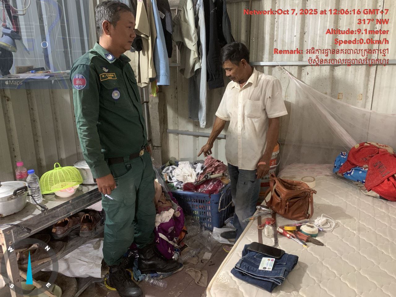 លោកអធិការបានបន្តថា តាមការបំភ្លឺរបស់ជនរងគ្រោះជាម្ចាស់ផ្ទះ បានឲ្យដឹងថា នៅវេលាម៉ោង ៦ព្រឹក ថ្ងៃទី៧ តុលា ២០២៥ គាត់បានចាក់សោផ្ទះចេញទៅធ្វើការនៅសង្កាត់ព្រែកកំពឹស។ លុះដល់វេលាម៉ោង ១១និង៣០នាទី ថ្ងៃដដែល ជនរងគ្រោះក៏បានត្រឡប់មកពីធ្វើការងារវិញដល់ផ្ទះ ស្រាប់តែឃើញទ្វារបាត់សោរ ហើយមានជាប់គន្លឹះពីខាងក្នុង។ ជនរងគ្រោះក៏បានទៅមើលតាមបង្អួចក្រោយផ្ទះ ហើយឃើញជនសង្ស័យកំពុងរើខោអាវ និងឥវ៉ាន់នៅក្នុងផ្ទះ។ មិនបង្អង់យូរ ជនរងគ្រោះក៏បានយកសោរដែលជនសង្ស័យបោះចោលនៅក្បែរនោះ មកចាក់គន្លឹះទ្វារពីខាងក្រៅ ហើយបានទូរសព្ទប្ដឹងសមត្ថកិច្ចប៉ុស្តិ៍ព្រែកហូរឲ្យចុះមកអន្តរាគមន៍ឃាត់ខ្លួនជនសង្ស័យនៅក្នុងផ្ទះតែម្ដង។