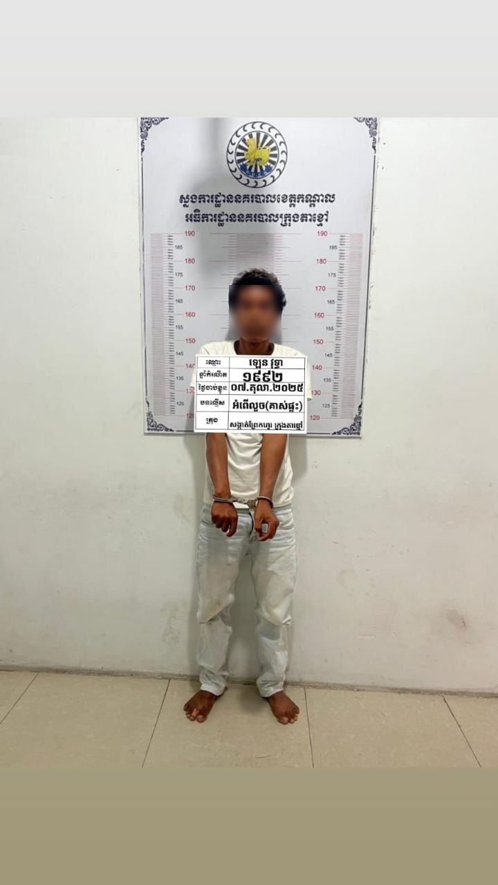 បុរសម្នាក់បានធ្វើសកម្មភាពគាស់ផ្ទះលួចទ្រព្យសម្បត្តិ ខណៈម្ចាស់មិននៅ តែភ្លេចគិតថាដល់ម៉ោងម្ចាស់ផ្ទះត្រឡប់មកវិញ។ ជនសង្ស័យរូបនេះត្រូវបានម្ចាស់ផ្ទះឃើញទាន់ ហើយបានទូរសព្ទប្ដឹងសមត្ថកិច្ចឲ្យចុះមកឃាត់ខ្លួននៅក្នុងផ្ទះតែម្ដង កាលពីព្រឹកថ្ងៃទី៧ តុលា ២០២៥។ ហេតុការណ៍នេះបានកើតឡើងនៅភូមិព្រែកហូរកើត១ សង្កាត់ព្រែកហូរ ក្រុងតាខ្មៅ ខេត្តកណ្ដាល។
