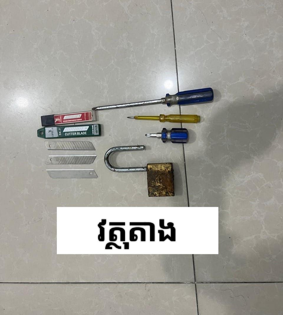 វត្ថុតាងដែលដកហូតបានរួមមាន សោរសូឡិច ១, ទួរណឺវីស ៣ដើម, កូនផ្លែកាំបិត ៣, ប្រអប់ដាក់កូនកាំបិត ២ និងទូរស័ព្ទរបស់ជនសង្ស័យ ១គ្រឿង។ ទ្រព្យសម្បត្តិរបស់ម្ចាស់ផ្ទះដែលបាត់បង់រួមមាន ខ្សែកធ្វើពីលោហៈធាតុពណ៌ទឹកប្រាក់ ១ខ្សែ, បន្តោងខ្សែករូបព្រះធ្វើពីលោហៈធាតុពណ៌ទង់ដែង ១, បន្តោងខ្សែករូបជ្រូកព្រៃស្រោបលោហៈធាតុពណ៌ទង់ដែង ៤, និងសំលៀកបំពាក់មួយចំនួន។