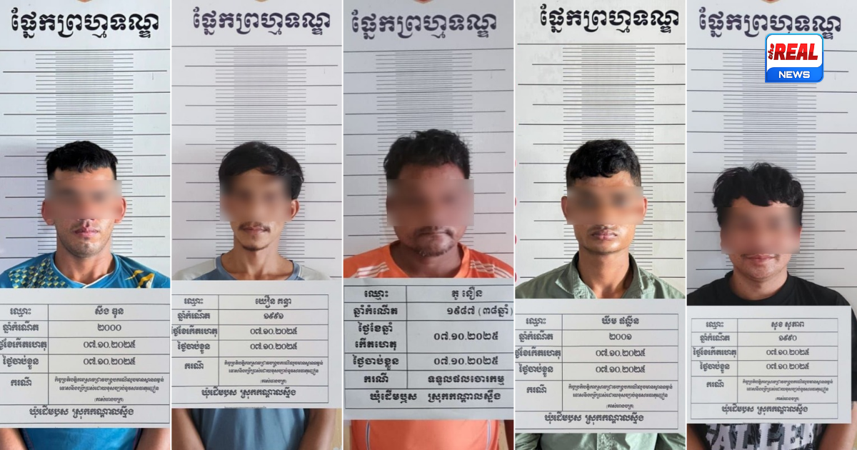 ជនសង្ស័យដែលឃាត់ខ្លួនបានមានចំនួន ៥នាក់ រួមមានឈ្មោះ សុខ សុភាព (ប្រុស, ៣៥ឆ្នាំ), ឈ្មោះ សឺង ឌុន (ប្រុស, ២៥ឆ្នាំ), ឈ្មោះ ឃឹម ផល្លីន (ប្រុស, ២៤ឆ្នាំ), ឈ្មោះ យឿន គន្ធា (ប្រុស, ៣៤ឆ្នាំ) និងឈ្មោះ តូ នឿន (ប្រុស, ៣៨ឆ្នាំ)។ ជនសង្ស័យចំនួន ៤នាក់មានសារធាតុញៀនក្នុងខ្លួនវិជ្ជមាន (+). វត្ថុតាងដែលដកហូតបានរួមមាន ម៉ូតូ ២គ្រឿង, ទូរសព្ទ ២គ្រឿង និងឧបករណ៍សម្រាប់ធ្វើសកម្មភាពលួចមួយចំនួន។