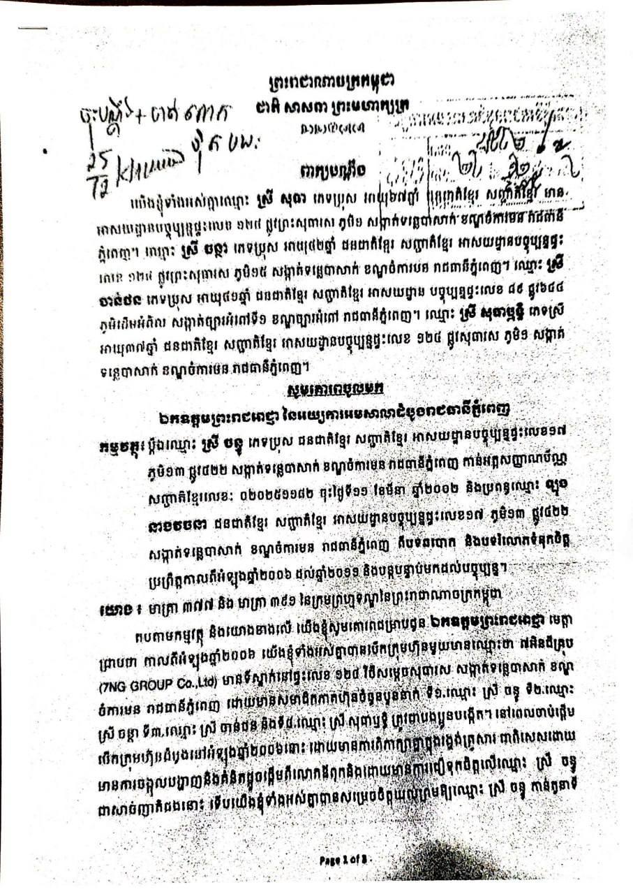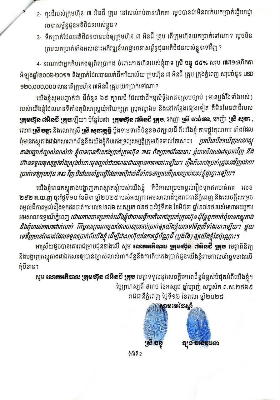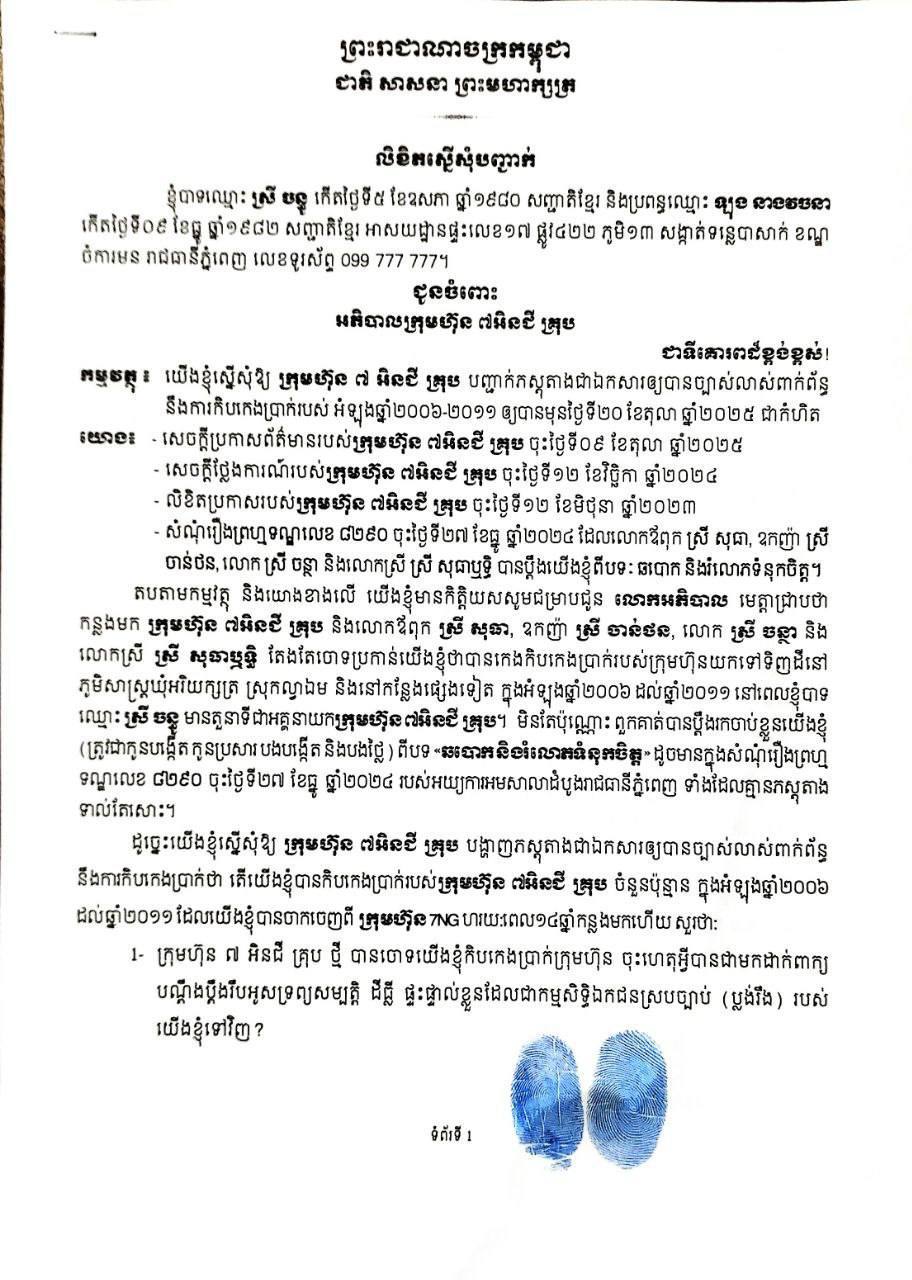 មិនតែប៉ុណ្ណោះ ពួកគាត់បានប្តឹងរកចាប់ខ្លួនយើងខ្ញុំ (ត្រូវជាកូនបង្កើត កូនប្រសារ បងបង្កើត និងបងថ្លៃ) ពីបទ«ឆបោក និងរំលោភទំនុកចិត្ត» ដូចមានក្នុងសំណុំរឿងព្រហ្មទណ្ឌលេខ ៨២៩០ ចុះថ្ងៃទី២៧ ខែធ្នូ ឆ្នាំ២០២៤ របស់អយ្យការអមសាលាដំបូងរាជធានីភ្នំពេញ ទាំងដែលគ្មានភស្តុតាងទាល់តែសោះ។ ដូច្នេះយើងខ្ញុំស្នើសុំឱ្យ ក្រុមហ៊ុន ៧អិនជី គ្រុប បង្ហាញភស្តុតាងជាឯកសារឲ្យបានច្បាស់លាស់ពាក់ព័ន្ធនឹងការកិបកេងប្រាក់ថា តើយើងខ្ញុំបានកិបកេងប្រាក់របស់ក្រុមហ៊ុន ៧អិនជី គ្រុប ចំនួនប៉ុន្មាន ក្នុងអំឡុងឆ្នាំ២០០៦ ដល់ឆ្នាំ២០១១ ដែលយើងខ្ញុំបានចាកចេញពី ក្រុមហ៊ុន 7NG រយៈពេល១៤ឆ្នាំ កន្លងមកហើយ។