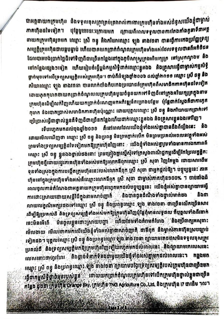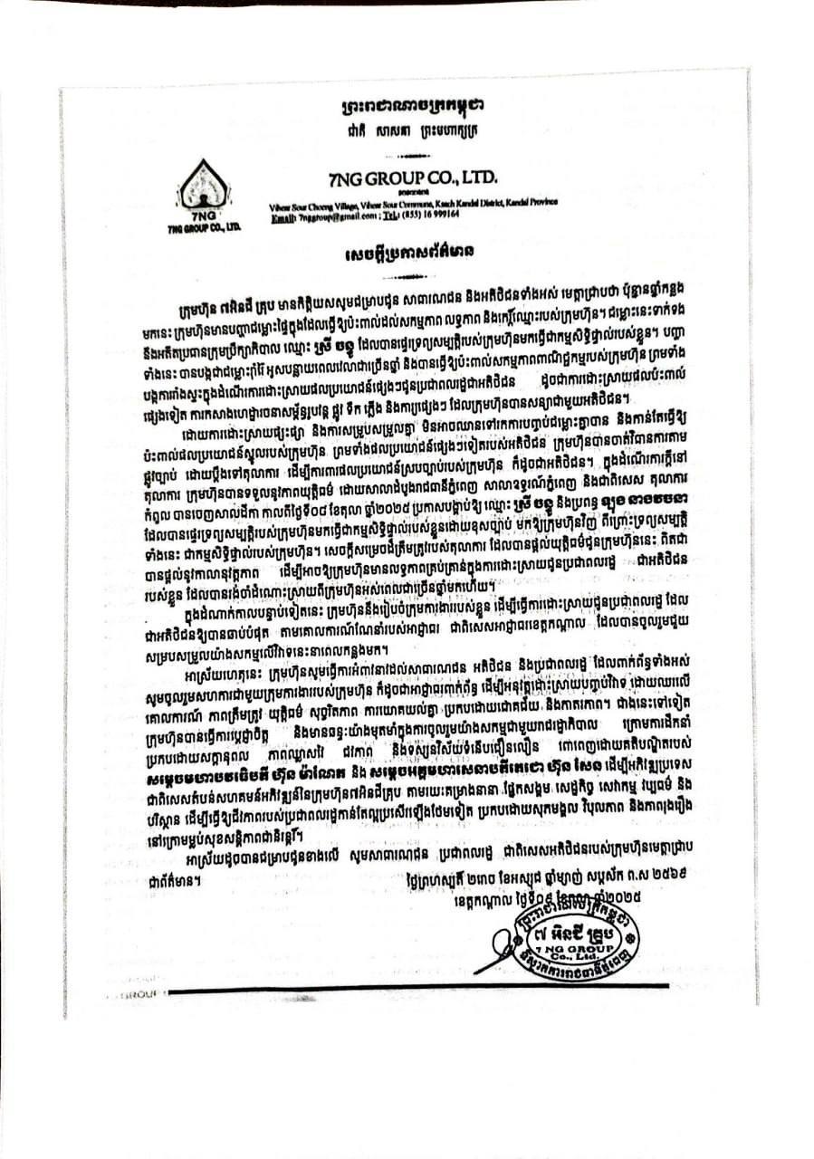យើងខ្ញុំសូមបញ្ជាក់ថា ដីចំនួន ៦៩ ក្បាលដី ដែលជាដីកម្មសិទ្ធិឯកជនស្របច្បាប់ (មានប្លង់រឹងទាំងអស់) របស់យើងខ្ញុំដែលមានទីតាំងភូមិសាស្ត្រឃុំអរិយក្សត្រ ស្រុកល្វាឯម និងនៅកន្លែងផ្សេងទៀត គឺមិនមែនជាដីរបស់ក្រុមហ៊ុន ៧អិនជី គ្រុបឡើយ។ ប៉ុន្តែបែរជា ក្រុមហ៊ុន ៧អិនជី គ្រុប, ឧកញ៉ា ស្រី ចាន់ថន,ឧកញ៉ា ស្រី សុធា , លោក ស្រី ចន្ថា និងលោកស្រី ស្រី សុធាឬទ្ធិ ប្តឹងទាមទារដីចំនួន៦៩ក្បាលដី ពីយើងខ្ញុំ តាមផ្លូវតុលាការ ទាំងដែលពុំមានភស្តុតាងជាឯកសារពាក់ព័ន្ធនឹងយើងខ្ញុំកិបកេងទ្រព្យសម្បត្តិក្រុមហ៊ុនទាល់តែសោះ។ប្រសិនបើរកឃើញមានភស្តុតាងបញ្ជាក់ច្បាស់លាស់ថា ខ្ញុំបាទបានកិបកេងប្រាក់ក្រុមហ៊ុន 7NG ពិតប្រាកដមែននោះ ខ្ញុំបាទនឹងសងជាប្រាក់វិញ និងហ៊ានទទួលខុសត្រូវទាំងស្រុងចំពោះមុខច្បាប់ជាធរមានដោយគ្មានការគេចវេះឡើយ។ រឿងកិបកេងប្រាក់ត្រូវសងវិញដោយប្រាក់ទៅក្រុមហ៊ុន7NG វិញ មិនមែននាំគ្នាធ្វើផែនការស៊ីដាច់ដីទាំង៦៩ក្បាលដីស្របច្បាប់របស់ខ្ញុំដូច្នោះឡើយ។