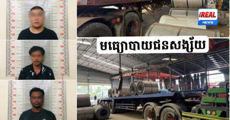 ជនសង្ស័យជាជនជាតិចិន និងខ្មែរចំនួន ៣នាក់ ត្រូវបានកម្លាំងសមត្ថកិច្ចចុះឃាត់ខ្លួនភ្លាមៗ ខណៈដែលពួកគេកំពុងធ្វើសកម្មភាពហែកឯកសាររបស់តុលាការ និងលួចដឹកដែកចេញពីរោងចក្រដែលកំពុងជាប់បម្រាមរក្សាការពារ។ ហេតុការណ៍នេះបានកើតឡើងកាលពីថ្ងៃទី៣ ធ្នូ ២០២៥ វេលាម៉ោង ៨ព្រឹក នៅចំណុចក្រុមហ៊ុនដែកហុងវ័ង ស្ថិតក្នុងភូមិថ្លើក ឃុំពើក ស្រុកអង្គស្នួល ខេត្តកណ្ដាល។