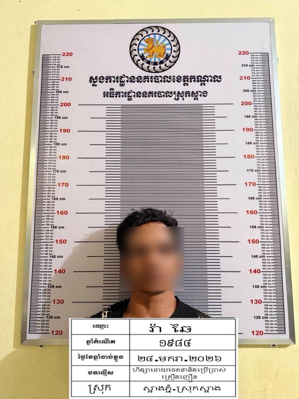 លោកវរសេនីយ៍ឯក រស់ ចន្ថា អធិការនគរបាលស្រុកស្អាង បានឲ្យដឹងថា ជនសង្ស័យដែលត្រូវបានឃាត់ខ្លួនមានឈ្មោះ រ៉ា ឆៃ (ប្រុស, ៤២ឆ្នាំ) មុខរបរកម្មករ មានទីលំនៅភូមិឃុំកើតហេតុ (ធ្លាប់ជាប់ពន្ធនាគារ២ឆ្នាំពីបទជួញដូរគ្រឿងញៀន និងពិនិត្យទឹកនោមមានសារធាតុញៀនវិជ្ជមាន)។ ចំណែកឯជនរងគ្រោះមានឈ្មោះ ឡុញ ឡេវ (ប្រុស, ២៥ឆ្នាំ) មុខរបរកម្មករ ស្នាក់នៅភូមិឃុំជាមួយគ្នា។ វត្ថុតាងដែលដកហូតបានរួមមាន កាំបិតផ្គាក់ផ្លែដែកដងឫស្សីប្រវែង១ម៉ែត្រ។