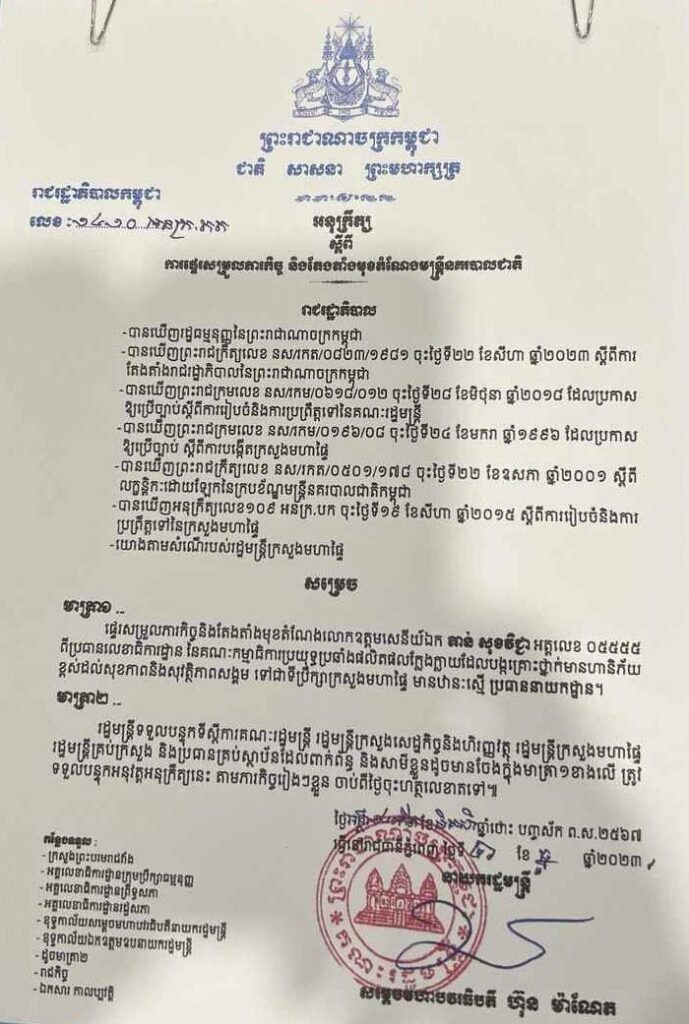 សម្ដេចមហាបវរធិបតី ហ៊ុន ម៉ាណែត នាយករដ្ឋមន្ដ្រីនៃកម្ពុជា បានចេញអនុក្រឹត្យផ្ទេរភារកិច្ចលោកឧត្តមសេនីយ៍ឯក តាន់ សុខវិជ្ជា ពីប្រធានលេខាធិការដ្ឋាន នៃគណៈកម្មាធិការជាតិប្រយុទ្ធប្រឆាំងផលិតផលក្លែងក្លាយដែលបង្កគ្រោះថ្នាក់មានហានិភ័យខ្ពស់ដល់សុខភាព និងសុវត្ថិភាពសង្គម ទៅជាទីប្រឹក្សាក្រសួងមហាផ្ទៃ មានឋានៈស្មើប្រធាននាយកដ្ឋាន ។ នេះបើយោងតាមអនុក្រឹត្យរបស់រាជរដ្ឋាភិបាលចុះថ្ងៃទី២៦ ខែធ្នូ ឆ្នាំ២០២៣ ។