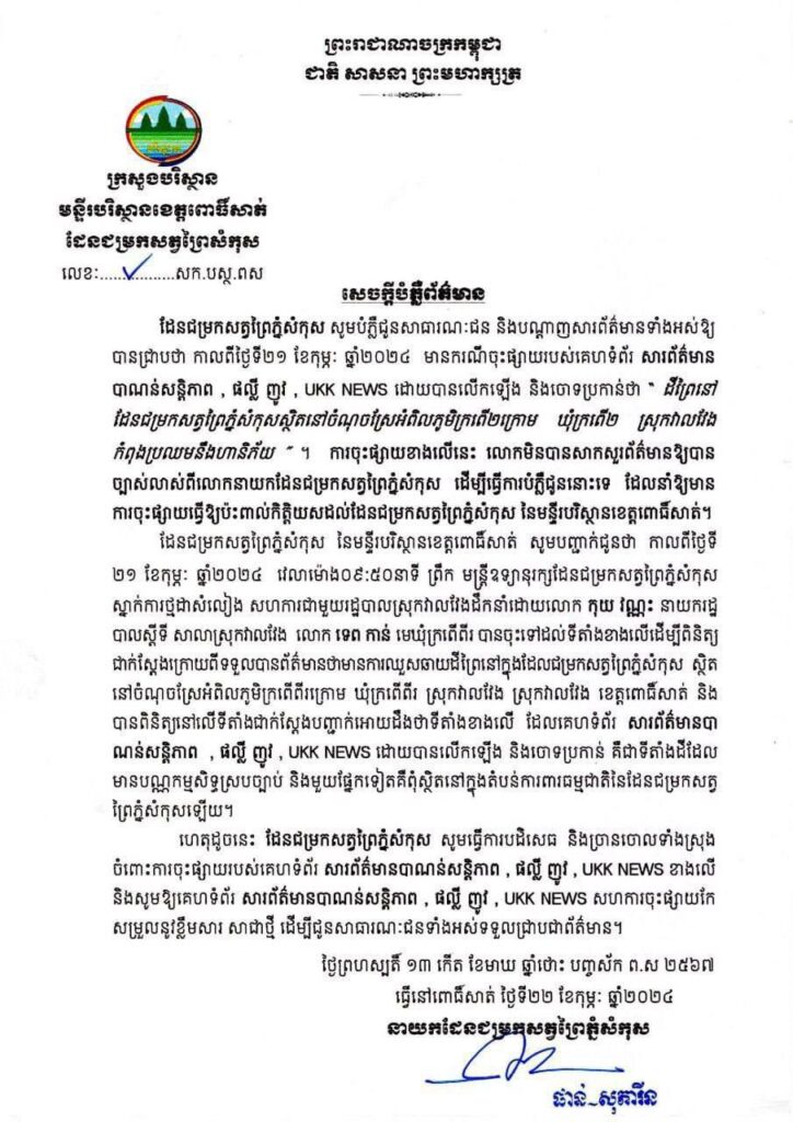ការបំភ្លឺនេះ ធ្វើឡើងបន្ទាប់ពីមានបណ្តាញសារព័ត៌មានក្នុងស្រុកមួយចំនួន បានធ្វើការចុះផ្សាយនូវអត្ថបទដែលមានខ្លឹមសារថា៖ «ដីព្រៃនៅ ដែនជម្រកសត្វព្រៃភ្នំសំកុស ស្ថិតនៅចំណុចស្រែអំពិល ភូមិក្រពើពីរក្រោម ឃុំក្រពើពីរ ស្រុកវាលវែង កំពុងប្រឈមហានិភ័យតាមរយៈឈ្មួញកំពុង ឈូសឆាយដាំដំណាំផ្សេងៗ» ។