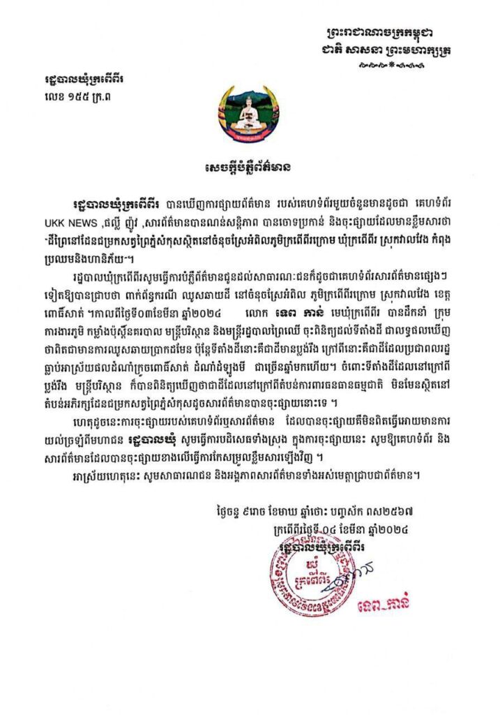 ការចុះផ្សាយរបស់គេហទំព័រ ឬសារព័ត៌មាន ដែលបានចុះផ្សាយមិនពិតធ្វើឱ្យមានការយល់ច្រឡំពី មហាជន រដ្ឋបាលស្រុក សូមធ្វើការបដិសេធទាំងស្រុង ក្នុងការចុះផ្សាយនេះ និងសូមឱ្យគេហទំព័រ និងសារព័ត៌មានដែលបានចុះផ្សាយខាងលើធ្វើការកែសម្រួលខ្លឹមសារឡើងវិញ ៕
