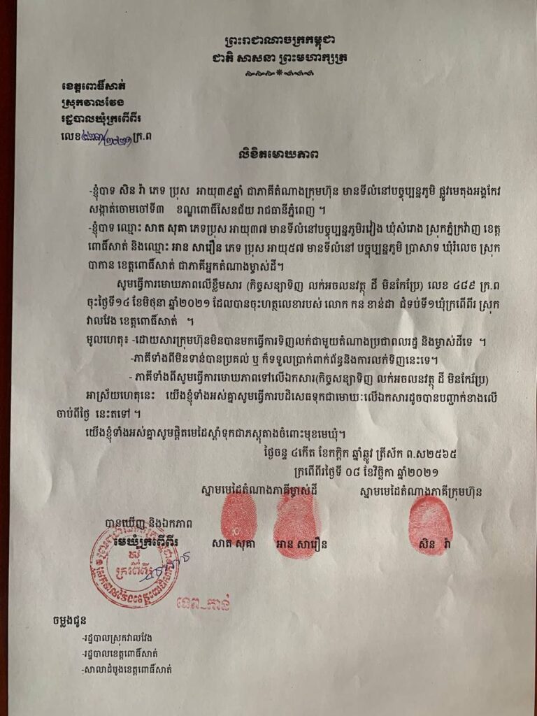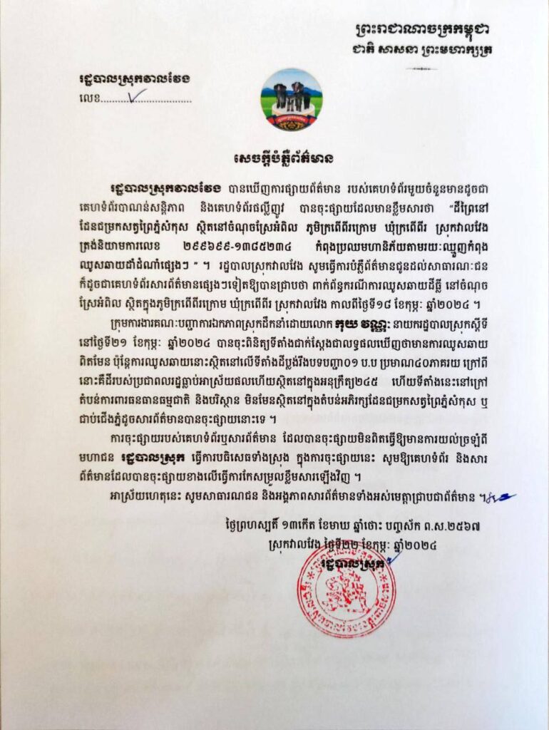 រដ្ឋបាលស្រុកវាលវែង បានចេញលិខិតបំភ្លឺ ពាក់ព័ន្ធករណីការឈូសឆាយដីធ្លី នៅចំណុចស្រែអំពិល ស្ថិតក្នុងភូមិក្រពើពីរក្រោម ឃុំក្រពើពីរ ស្រុកវាលវែង ខេត្តពោធិ៍សាត់ កាលពីថ្ងៃទី១៨ ខែកុម្ភៈ ឆ្នាំ២០២៤ ។