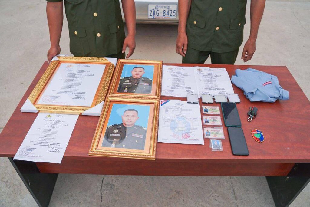 បន្ទាប់ពីឃាត់ខ្លួនជសង្ស័យទាំង ២នាក់ខាងលើ កម្លាំងជំនាញបានធ្វើការដកហូតវត្ថុតាងមួយចំនួនរួមមាន៖ មួកកាសស្កេតពណ៌ត្រេអ៊ី២, សម្លៀកបំពាក់យោធាលេខ៣ (២កំប្លេរ), ខ្សែក្រវាត់យោធា១, ស័ក្ដិ ២គូ, គ្រឿងគ្រឿងឥស្សរិយយស ២ផ្ទាំង, ផ្លាកឈ្មោះ១, សញ្ញាអគ្គបញ្ជាការ២, សញ្ញាកងយោធពលខេមរភូមិន្ទ២, ស៊ីងកាំភ្លើងពាក់កអាវ ២គូ, សញ្ញាកងការពារព្រំដែន១ (ក្រណាត់), សេចក្ដីសម្រេចតែងតាំង ២សន្លឹក, លិខិតបញ្ជាបេសកកម្ម១សន្លឹក, Laptob ១គ្រឿង, រថយន្ដ១គ្រឿង ម៉ាក់ហាយឡិនឌឺពណ៌ទឹកប្រាក់សេរីឆ្នាំ២០០៤ ស្លាកលេខ ភ្នំពេញ2AG-8425 និងលិខិតធានាមិនទាន់បំពេញ៣សន្លឹក ។