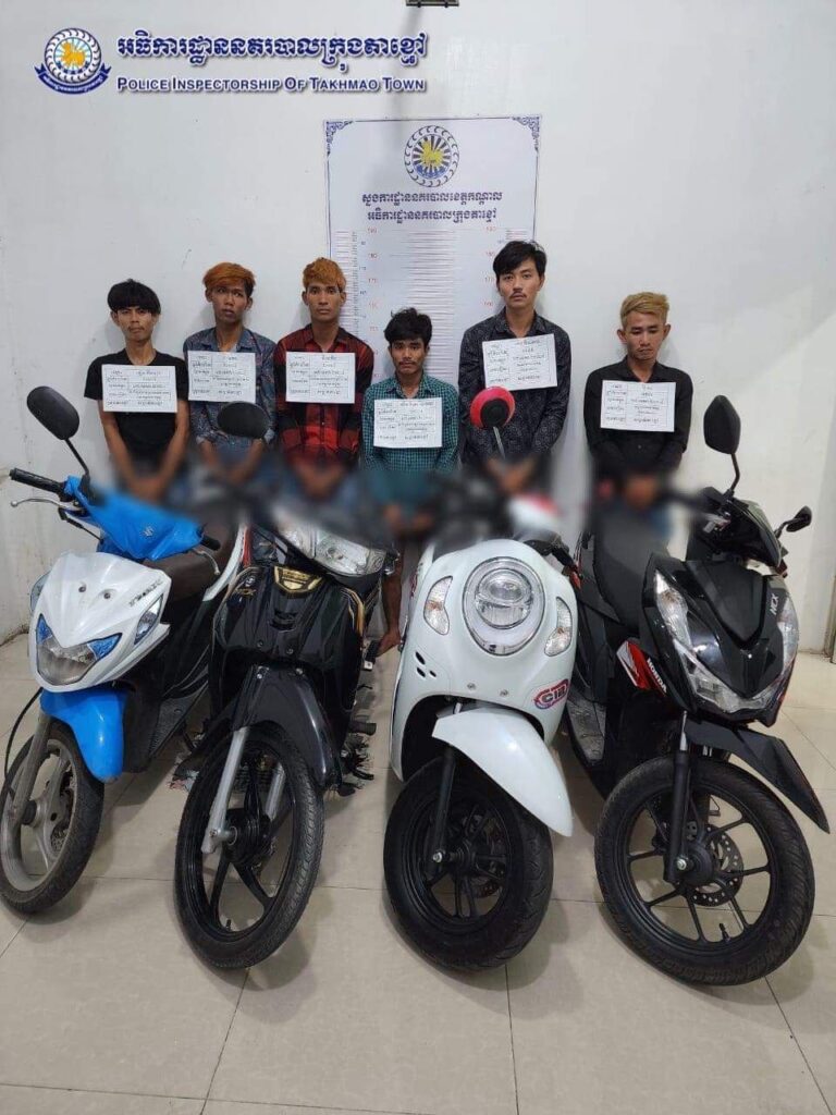 ចំពោះជនសង្ស័យ ៦នាក់ ដែលត្រូវបានឃាត់ខ្លួនទី១-ឈ្មោះ ជា មករា ភេទប្រុស អាយុ ១៧ឆ្នាំ មានទីលំនៅភូមិលេខ១ សង្កាត់ស្វាយរលំ ក្រុងតាខ្មៅ ខេត្តកណ្តាល,មុខរបរមិនពិតប្រាកដ (ឃាត់ខ្លួន) គ្មានសារធាតុញៀនក្នុងទឹកនោម(-) ។ ទី២-ឈ្មោះ ខៀវគឹមឡុង ភេទប្រុស អាយុ ១៧ឆ្នាំ មានទីលំនៅភូមិព្រែកសំរោង១ សង្កាត់តាខ្មៅ ក្រុងតាខ្មៅ ខេត្តកណ្តាល មុខរបរមិនពិតប្រាកដ (ឃាត់ខ្លួន) ធ្លាប់ជាប់ពន្ធនាគារខេត្តកណ្តាលរយៈពេល ២ឆ្នាំ ករណីលួចមានស្ថានទម្ងន់ទោស (ធាក់ប្លន់យកម៉ូតូ) មានសារធាតុញៀនក្នុងទឹកនោម(+) ។ ទី៣-ឈ្មោះ ឌី ដេវីដ ភេទប្រុស អាយុ ១៧ឆ្នាំ មានទីលំនៅភូមិបត្តាជី សង្កាត់ព្រែកហូរ ក្រុងតាខ្មៅ ខេត្តកណ្តាល មុខរបរមិនពិតប្រាកដ (ឃាត់ខ្លួន) មានសារធាតុញៀនក្នុងទឹកនោម(+) ។ ទី៤-ឈ្មោះ ឃឹម ចិត្រា ភេទប្រុស អាយុ ១៧ឆ្នាំ មានទីលំនៅភូមិលេខ១ សង្កាត់ស្វាយរលំ ក្រុងតាខ្មៅ មុខរបរមិនពិតប្រាកដ (ឃាត់ខ្លួន) មានសារធាតុញៀនក្នុងទឹកនោម(+) ។ ទី៥-ឈ្មោះ អ៊ូ ពៅ ភេទប្រុស អាយុ ២៨ឆ្នាំ មានទីលំនៅភូមិមិត្តភាព សង្កាត់ឬស្សីកែវ ខណ្ឌឬស្សីកែវ រាជធានីភ្នំពេញ មុខរបរមិនពិតប្រាកដ អ្នកទទួលទិញម៉ូតូ (ឃាត់ខ្លួន) មានសារធាតុញៀនក្នុងទឹកនោម(+) ។ ទី៦-ឈ្មោះ ប៉េង គឹមសេង ភេទប្រុស អាយុ ២៥ឆ្នាំ មានទីលំនៅភូមិក្រោលគោ សង្កាត់ឬស្សីកែវ ខណ្ឌឬស្សីកែវ រាជធានីភ្នំពេញ,មុខរបរមិនពិតប្រាកដ អ្នកទទួលទិញម៉ូតូ (ឃាត់ខ្លួន)មធ្លាប់ជាប់ពន្ធនាគារព្រៃសរយៈពេល ៦ខែ ករណីទទួលផលចោរកម្ម មានសារធាតុញៀនក្នុងទឹកនោម (+) ។