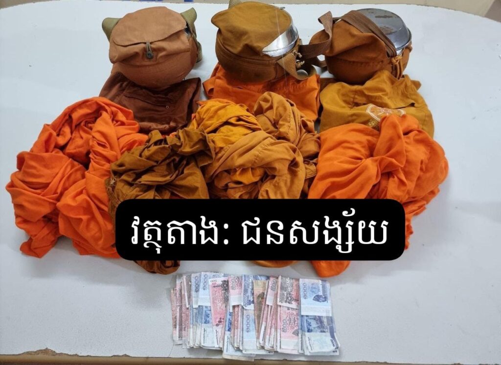 ចំណែកវត្ថុតាងដែលសមត្ថកិច្ចដកហូតរួមមាន បាត្រចំនួន០៣, ថង់យាមចំនួន០៣ , ស្បង់ចីវរចំនួន៣កំប្លេ ប្រាក់ចំនួន ៨៩.៥០០រៀល (ប្រាំបីម៉ឺនប្រាំបួនពាន់ប្រាំរយរៀល) ។