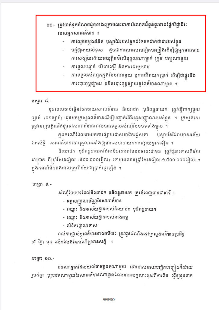 Share Telegram Facebook WhatsApp Pinterest Twitter Email Copy Link ក្រសួងព័ត៌មាន បានចេញប្រកាសសម្រេចលុបអាជ្ញាប័ណ្ណ គេហទំព័រ ជីជីធីវី www.gg-tv.net ក្រោយម្ចាស់អង្គភាពបំពានលើមាត្រា៧ ចំណុចទី១១ នៃច្បាប់ស្តីពីរបបអ្នកសារព័ត៌មាន និងអនុវត្តផ្ទុយនឹងកិច្ចសន្យាអាជីវកម្មរបស់សាមីខ្លួន ដែលបានតម្កល់ទុកនៅក្រសួងព័ត៌មាន ។ ច្បាប់ស្តីពីរបបអ្នកសារព័ត៌មាន ក្រកាសរបស់ក្រសួងព័ត៌មាន ចុះថ្ងៃទី១៦ ខែកក្កដា ឆ្នាំ២០២៤