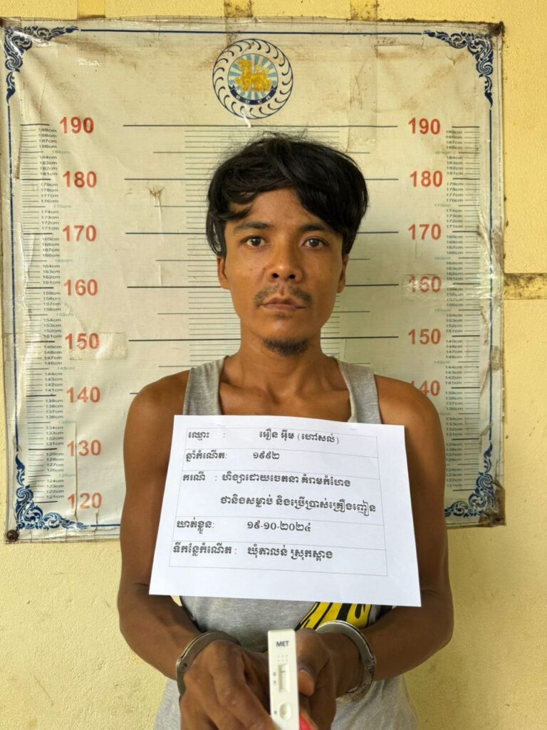 ជនសង្ស័យម្នាក់ ធ្លាប់ជាប់ពន្ធនាគារ ២ឆ្នាំ ករណីប្រើប្រាស់គ្រឿងញៀន ពេលបានចេញមកវិញមិនកែប្រែ នៅតែបន្តប្រើប្រាស់គ្រឿងញៀន មិនតែប៉ុណ្ណោះ នៅហ៊ានគំរាមសម្លាប់ឪពុកខ្លួនឯងទៀត ចុងក្រោយក៏ត្រូវសមត្ថកិច្ចចាប់វាយខ្នោះ ។ ហេតុការណ៍ខាងលើ បានកើតឡើងកាលពីល្ងាច ចុងសប្តាហ៍កន្លងទៅ នៅចំណុចភូមិព្រែកស្លែង ឃុំតាលន់ ស្រុកស្អាង ខេត្តកណ្តាល ។