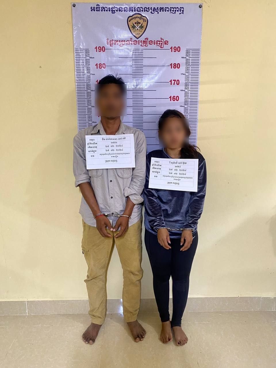ជនសង្ស័យ ប្រុស-ស្រី ២នាក់ ក្នុងចំណោមបក្ខពួក ៣នាក់ ត្រូវបានកម្លាំងនគរបាលប៉ុស្តិ៍វិហារលួង ឆ្មក់បង្ក្រាបឃាត់ខ្លួន ខណៈដែលពួកគេកំពុងប្រមូលផ្តុំគ្នាជក់គ្រឿងញៀន នៅចំណុចទ្វារទំនប់ទឹកក្រាំងប្រលៃ ភូមិប្រក់ក្ដា ឃុំវិហារលួង ស្រុកពញាឮ ខេត្តកណ្តាល កាលពីវេលាម៉ោងជាង ១២យប់ រំលងអធ្រាត្រ ឈានចូលថ្ងៃទី២៩ ខែមករា ឆ្នាំ២០២៥ ។