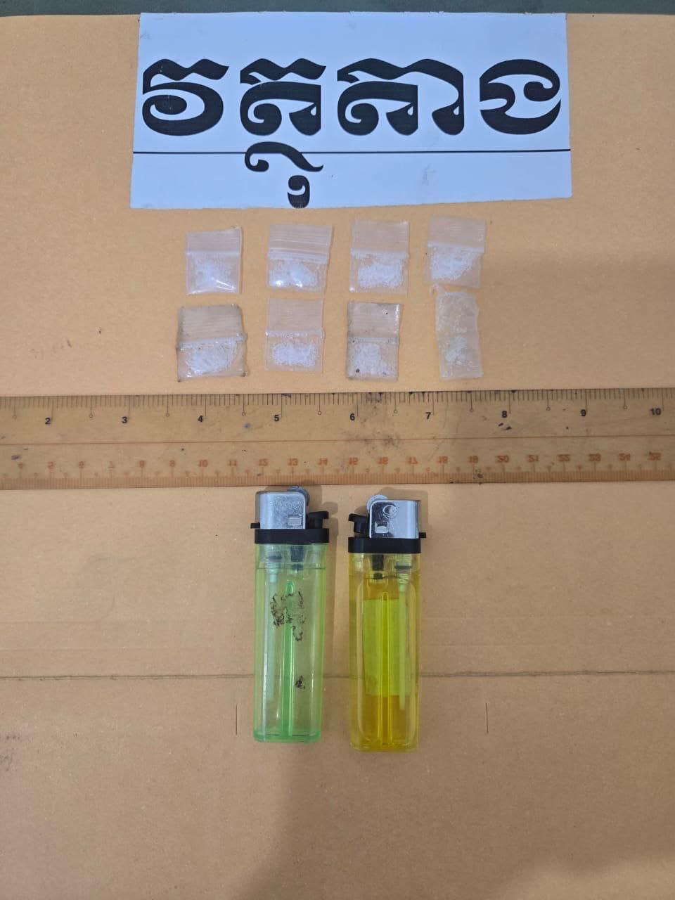 នៅក្នុងការឆែកឆេរ សមត្ថកិច្ចបានរកឃើញម្សៅក្រាមពណ៌សថ្លាសង្ស័យជាសារធាតុញៀន (ម៉ាទឹកកក) ចំនួន ០៨កញ្ចប់ ដែលជនសង្ស័យលាក់ទុកក្នុងហោប៉ៅខោក្រោយខាងស្តាំ។ ក្រៅពីគ្រឿងញៀន សមត្ថកិច្ចក៏បានដកហូតវត្ថុតាងផ្សេងទៀតរួមមាន កាំបិតតាំងតោចំនួន ០១ និងដែកកេះចំនួន ០២។