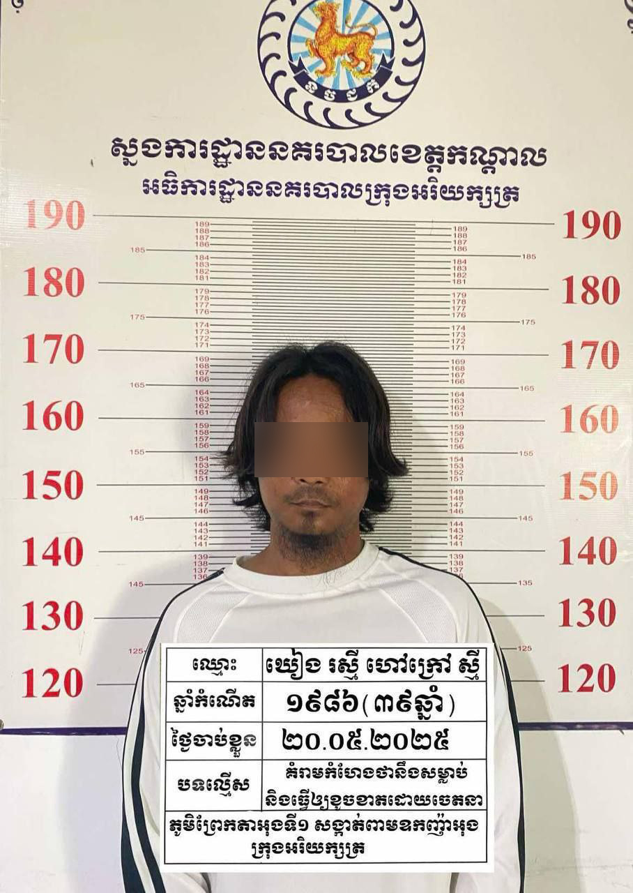 កណ្តាល ៖ សមត្ថកិច្ចបានឃាត់ខ្លួនជនសង្ស័យម្នាក់តាមពាក្យបណ្តឹងរបស់ជនរងគ្រោះ ករណីគំរាមថានឹងសម្លាប់ ថែមទាំងកាប់សត្វឆ្កែរបស់ជនរងគ្រោះឲ្យងាប់ និងធ្វើឲ្យខូចខាតទ្រព្យសម្បត្តិដោយចេតនា។ ហេតុការណ៍នេះបានកើតឡើងកាលពីវេលាម៉ោង ១៥:០០នាទី ថ្ងៃទី១៩ ខែឧសភា ឆ្នាំ២០២៥ នៅមុខផ្ទះជនរងគ្រោះ ស្ថិតក្នុងភូមិព្រែកតាអុងទី១ សង្កាត់ពាមឧកញ៉ាអុង ក្រុងអរិយក្សត្រ ខេត្តកណ្តាល។