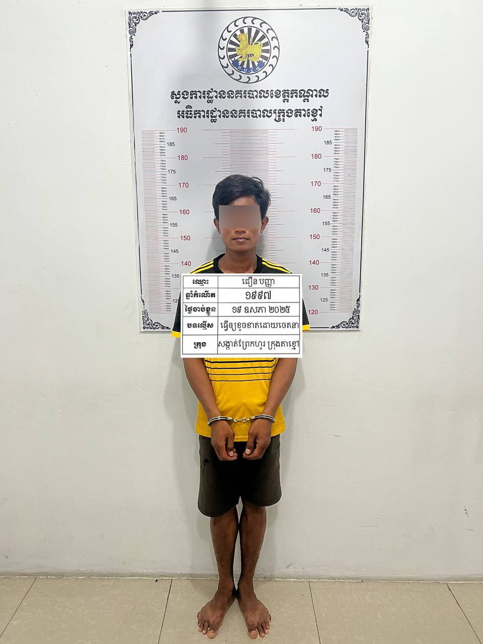 កណ្តាល ៖ ជនសង្ស័យម្នាក់ត្រូវបានសមត្ថកិច្ចឃាត់ខ្លួន តាមពាក្យបណ្តឹងរបស់ជនរងគ្រោះ ករណីធ្វើឲ្យខូចខាតទ្រព្យសម្បត្តិដោយចេតនា និងគំរាមកំហែង។ ហេតុការណ៍នេះបានកើតឡើងកាលពីវេលាម៉ោង ១២:១៥នាទី ថ្ងៃទី១៩ ខែឧសភា ឆ្នាំ២០២៥ នៅចំណុចមុខផ្ទះជនរងគ្រោះ ស្ថិតក្នុងភូមិព្រែកហូរលិច សង្កាត់ព្រែកហូរ ក្រុងតាខ្មៅ ខេត្តកណ្តាល។