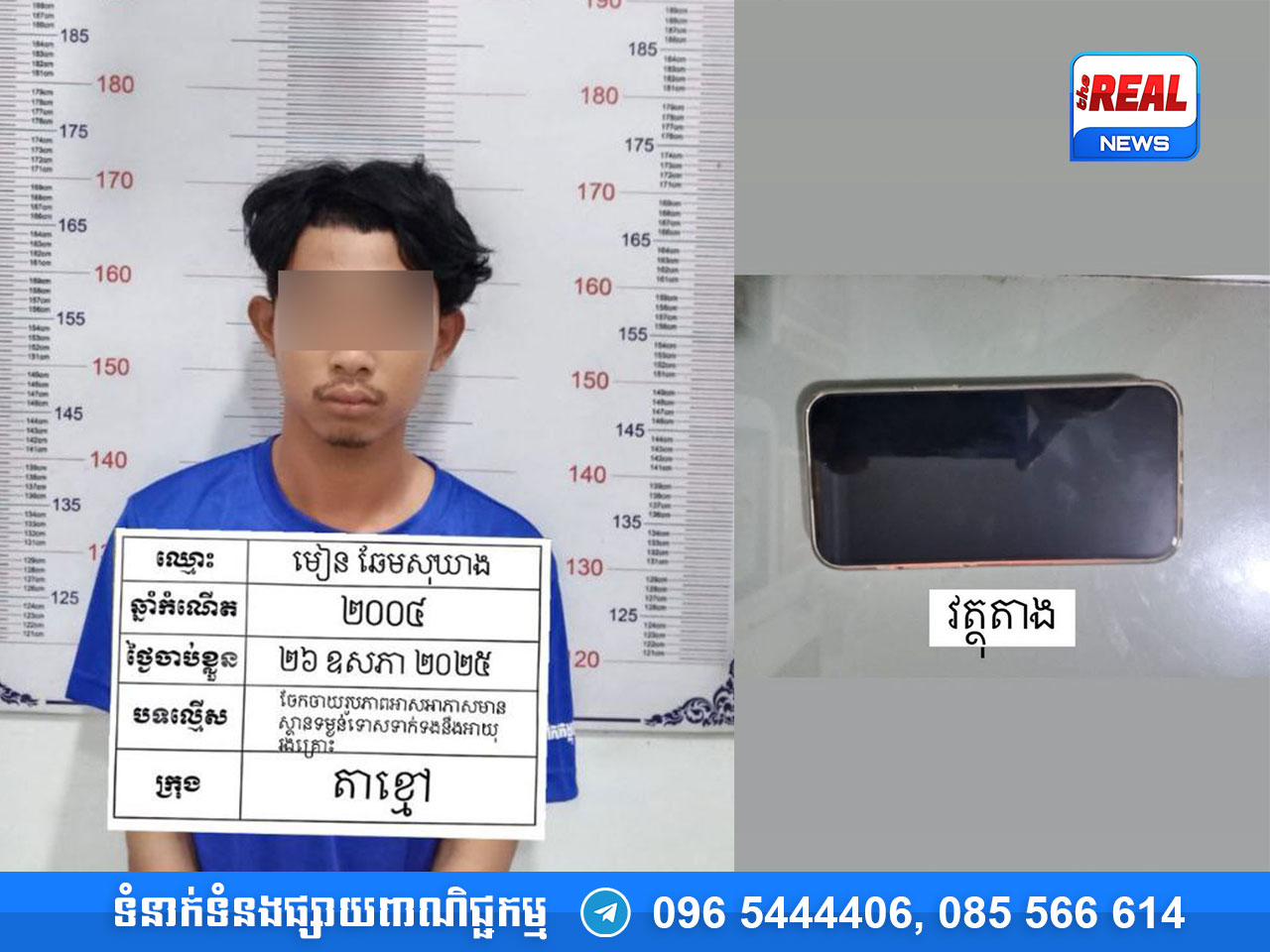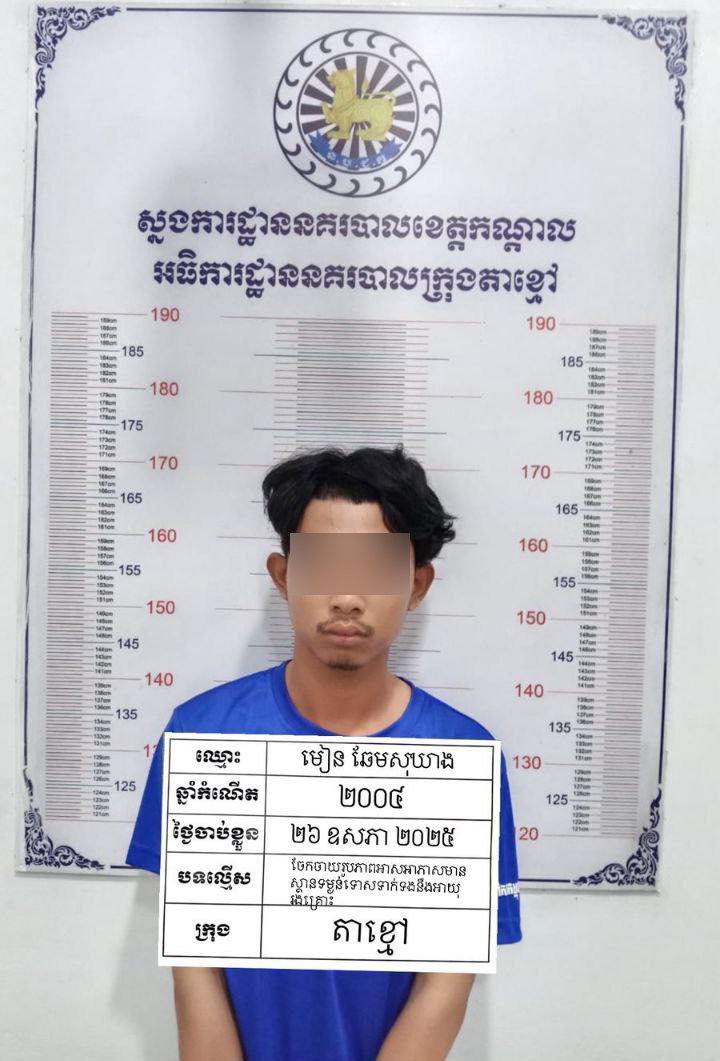 យុវជនម្នាក់ត្រូវបានកម្លាំងសមត្ថកិច្ចនៃអធិការដ្ឋាននគរបាលក្រុងតាខ្មៅ ធ្វើការឃាត់ខ្លួន ពាក់ព័ន្ធនឹងករណីចែកចាយរូបភាពអាសអាភាសមានស្ថានទម្ងន់ទោសទាក់ទងនឹងអាយុរបស់ជនរងគ្រោះ បន្ទាប់ពីជនសង្ស័យបានផ្ញើរូបភាព និងវីដេអូឃ្លីបស្និទ្ធស្នាលជាមួយអតីតសង្សារជាអនីតិជនវ័យ ១៧ឆ្នាំ ទៅកាន់ម្តាយរបស់នាង ព្រមទាំងគំរាមបង្ហោះជាសាធារណៈ។ ការឃាត់ខ្លួនជនសង្ស័យនេះ បានធ្វើឡើងនៅថ្ងៃទី២៦ ខែឧសភា ឆ្នាំ២០២៥ តាមពាក្យបណ្តឹងរបស់ម្តាយក្មេងស្រីរងគ្រោះ។