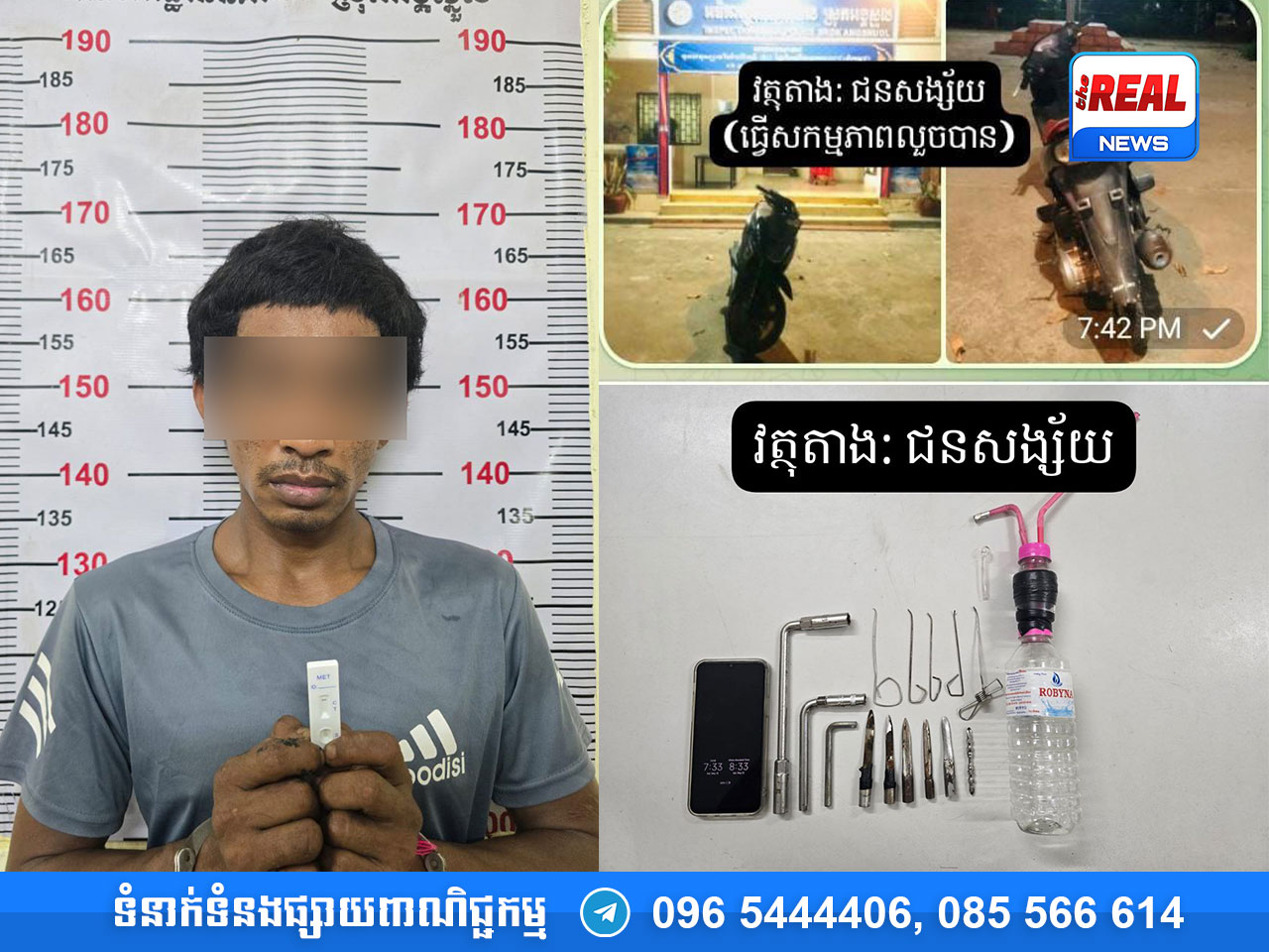 វត្ថុតាងដែលចាប់យកបានរួមមាន៖ ម៉ូតូមួយគ្រឿងម៉ាក Suzuki Nex ពណ៌ខ្មៅ គ្មានផ្លាកលេខ (ជាមធ្យោបាយដែលជនសង្ស័យធ្វើសកម្មភាពលួចកាច់កបាន), ទូរសព្ទដៃមួយគ្រឿងម៉ាក MI ពណ៌ប្រផះ, ដែកខ្សៀររាងអក្សរអិលចំនួន ០២ ដើម, ដែកតាន់ប្រាំបីជ្រុងរាងអក្សរអិល ០១ ដើម, ដែកតាន់រាងសំប៉ែតសម្រាប់កាច់សោកម៉ូតូចំនួន ០៥ ដើម, សរសៃលួសកែច្នៃសម្រាប់ឆ្កឹសមេសោចំនួន ០៥ សរសៃ, និងឧបករណ៍សម្រាប់ប្រើប្រាស់គ្រឿងញៀនមួយចំនួន។