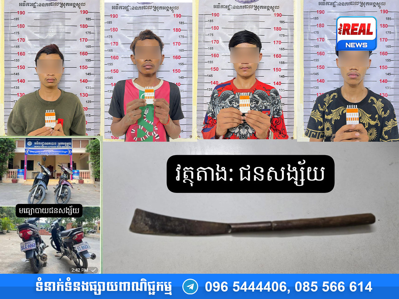 ជនសង្ស័យដែលត្រូវបានឃាត់ខ្លួនមានចំនួន ០៤ នាក់ រួមមាន៖ ឈ្មោះ ចិន្តា ចំរើនរាជ្យ ហៅ ជា ភេទប្រុស អាយុ ១៦ ឆ្នាំ ជនជាតិខ្មែរ មុខរបរកម្មកររោងចក្រ មានទីលំនៅភូមិត្រពាំងឈូក ឃុំពើក ស្រុកអង្គស្នួល ខេត្តកណ្ដាល (ជាអ្នកបើកម៉ូតូ គ្មានសារធាតុញៀនក្នុងទឹកនោម), ឈ្មោះ ឌៀង ករុណា ហៅ លត ភេទប្រុស អាយុ ១៥ ឆ្នាំ ជនជាតិខ្មែរ មុខរបរមិនពិត មានទីលំនៅភូមិទន្លាប់ខ្ពស់ត្បូង ឃុំដំណាក់អំពិល ស្រុកអង្គស្នួល ខេត្តកណ្ដាល (ជាអ្នកកាន់កាំបិតជិះពីក្រោយ គ្មានសារធាតុញៀនក្នុងទឹកនោម), ឈ្មោះ វី កក្កដា ភេទប្រុស អាយុ ១៧ ឆ្នាំ ជនជាតិខ្មែរ មុខរបរសិស្ស មានទីលំនៅភូមិត្រពាំងឈូក ឃុំពើក ស្រុកអង្គស្នួល ខេត្តកណ្ដាល (ជាអ្នកបើកម៉ូតូ គ្មានសារធាតុញៀនក្នុងទឹកនោម), និងឈ្មោះ ហាន ឆាយអ៉ី ហៅ អ៉ី ភេទប្រុស អាយុ ១៦ ឆ្នាំ ជនជាតិខ្មែរ មុខរបរកម្មករោងចក្រ មានទីលំនៅភូមិថ្លើក ឃុំពើក ស្រុកអង្គស្នួល ខេត្តកណ្ដាល (ជាអ្នកជិះពីក្រោយ គ្មានសារធាតុញៀនក្នុងទឹកនោម)។