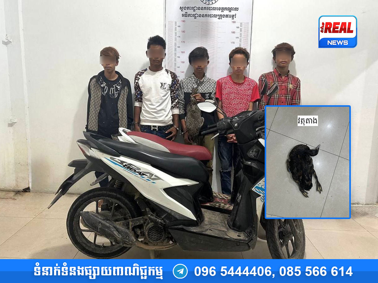 ខេត្តកណ្ដាល៖ ក្រុមក្មេងទំនើងចំនួន ៥នាក់ ដែលសុទ្ធសឹងតែជាមុខសញ្ញាចាស់ ត្រូវបានកម្លាំងនគរបាលក្រុងតាខ្មៅ ឃាត់ខ្លួនបាន បន្ទាប់ពីពួកគេបានធ្វើសកម្មភាពលួចសត្វទាអ្នកស្រុកដើម្បីយកមកធ្វើជាសាច់ក្លែម ក្រោយផឹកស្រាអស់។ ហេតុការណ៍នេះបានកើតឡើងកាលពីវេលាម៉ោង ៣:៣០នាទីទាបភ្លឺថ្ងៃទី៥ ខែមិថុនា ឆ្នាំ២០២៥ នៅចំណុចភូមិលេខ១ សង្កាត់ស្វាយរលំ ក្រុងតាខ្មៅ ខេត្តកណ្ដាល។