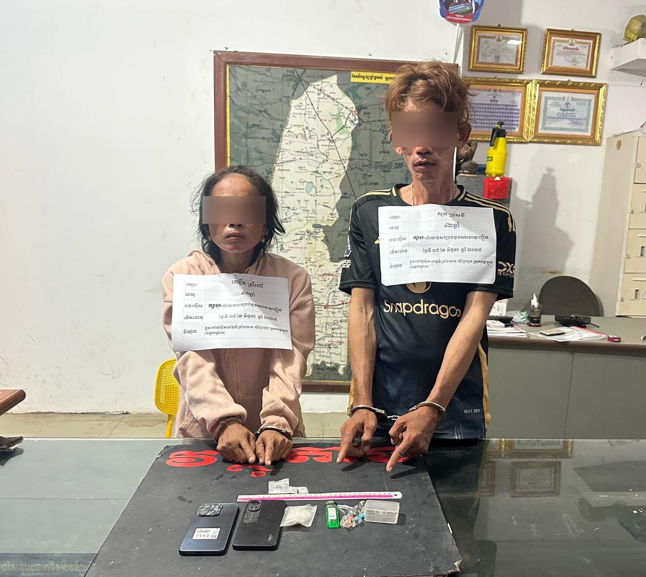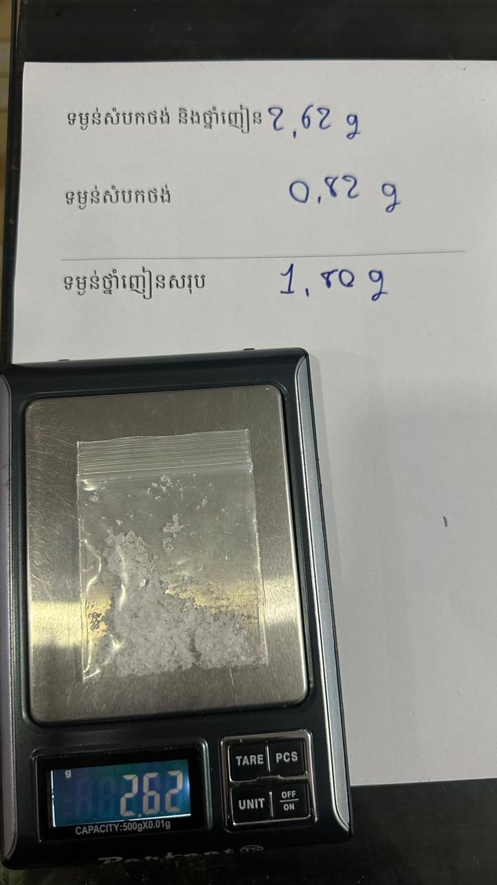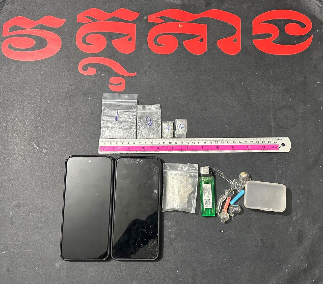 លោកអធិការបានបន្តថា វត្ថុតាងដែលដកហូតបានរួមមាន៖ ម្សៅក្រាមសថ្លាសង្ស័យថាជាសារធាតុញៀន (ម៉ាទឹកកក) ៤កញ្ចប់តូច ទម្ងន់ ១,៨០ក្រាម, ទូរស័ព្ទដៃ ២គ្រឿង គឺម៉ាក Oppo ពណ៌ខ្មៅ និងម៉ាក Infinix ពណ៌ប្រផេះ, ឧបករណ៍ប្រើប្រាស់ វេចខ្ចប់ថ្នាំញៀនមួយចំនួន, និងម៉ូតូ ១គ្រឿង ម៉ាក Honda Dream C125 ពណ៌ខ្មៅ សេរីឆ្នាំ២០០៦** គ្មានផ្លាកលេខ**។