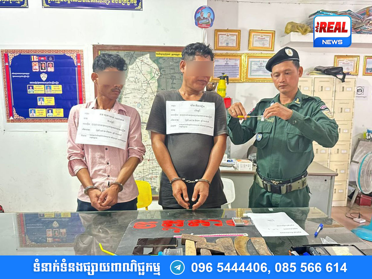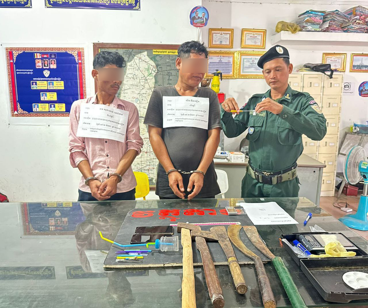 លោកអធិការបានឲ្យដឹងទៀតថា វត្ថុតាងដកហូតបានរួមមាន៖ ម្សៅក្រាមសថ្លា សង្ស័យសារធាតុញៀន (ម៉ាទឹកកក) ២កញ្ចប់តូច ទម្ងន់ ០,៣២ក្រាម, ទូរស័ព្ទដៃ ២គ្រឿង (ម៉ាក OPPO ពណ៌ខៀវចាស់, Infinix ពណ៌លឿង), កាំបិតផ្គាក់ ៣, ពូថៅ ២, និងឧបករណ៍ប្រើប្រាស់ វេចខ្ចប់ថ្នាំញៀនមួយចំនួន។