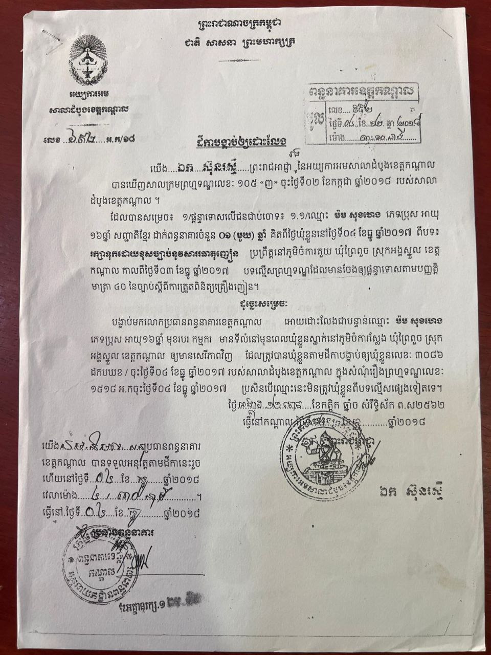 លោកវរសេនីយ៍ឯក មាន សំណាង អធិការនគរបាលស្រុកអង្គស្នួលបានឲ្យដឹងថា ជនសង្ស័យទាំង ២នាក់ ដែលត្រូវបានឃាត់ខ្លួនរួមមាន៖ យឹម គឹមយឿន (ប្រុស, ៤៦ឆ្នាំ) រស់នៅភូមិចំបក់ទន្សាយ ឃុំព្រៃពួច ស្រុកអង្គស្នួល (ប្រើប្រាស់គ្រឿងញៀនប្រហែល ២ឆ្នាំ, លក់ប្រហែល ២ខែ), និងមម សុងហេង ហៅ ចេវ (ប្រុស, ២៤ឆ្នាំ) រស់នៅភូមិចំការស្លែង ឃុំព្រៃពួច ស្រុកអង្គស្នួល (ប្រើប្រាស់គ្រឿងញៀនប្រហែល ១ឆ្នាំ, លក់បាន ១លើក). ជនសង្ស័យមម សុងហេង ធ្លាប់ជាប់ពន្ធនាគារខេត្តកណ្ដាល ១លើក រយៈពេល ១ឆ្នាំ ពីបទរក្សាទុកដោយខុសច្បាប់នូវសារធាតុញៀន។ ជនសង្ស័យទាំង ២នាក់ សុទ្ធតែមានសារធាតុញៀនក្នុងទឹកនោម (+)។